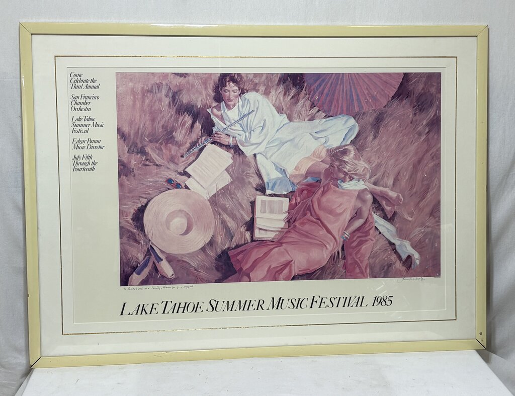 Frame: 30.25"H x 41.75"W x 1"D Image Area: 21.5"H x 34"W Very Good Condition Bruce Wolfe Signed & Dedicated Lake Tahoe Summer Music Festival 1985 Promotional Poster