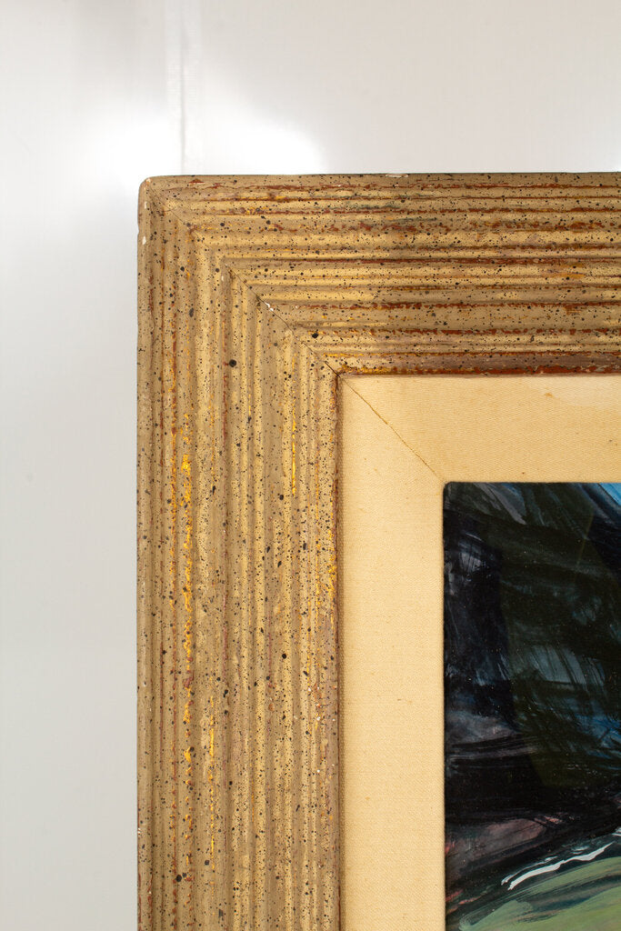 Description: Signed and numbered (#142) watercolor painting by Dan Lutz, framed w/ glass and single matted. Condition: The frame shows minor distressing and the mat has light staining and discoloring.