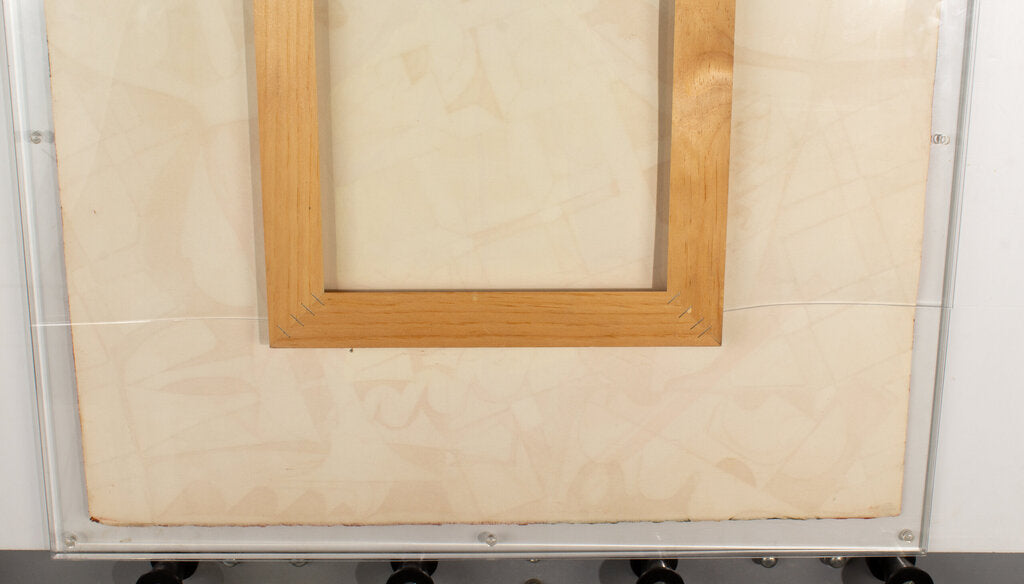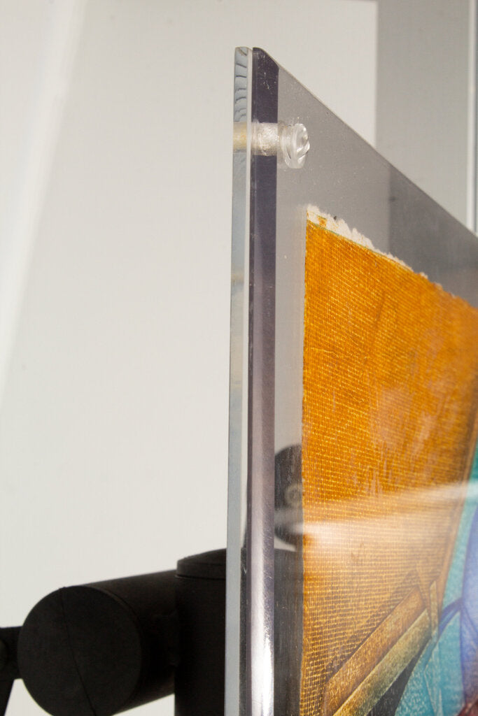 Description: This lot contains a book w/ eight pieces of artwork by Gerard Fitremann, eight poems by Kenneth White, printed on vellum and some information about the artist and the exhibition. Three of the eight art pieces have been mounted in plexiglass frames with a French cleat wood hanging frame. Frame: 38.5"x27.5"x1" Artwork: 35.5"X24.5" Book: 37.5"x26.5"x1" (8 pieces of art , 8 poems, 1 book, plus info sheets from the book. ) Condition: The framed pieces have small scratches on the surface of the plexiglass, as well as minor scratching around the screw holes. One frame is missing 1 plastic screw, two frames are missing 2 plastic screws and the plexiglass frame is cracked along the back of one of the pieces. The book has damaged corners and binding. The poems are a bit discolored with some creasing and curling.