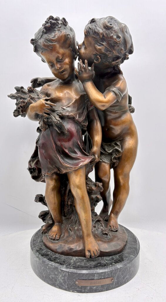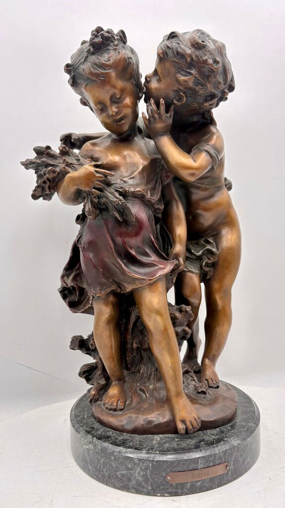 Over All: 17.5"H x 10.5"W x 11.5"D Excellent Condition French Late 19th C. Auguste Moreau "The Secret" Bronze Cast Sculpture Signed #10/100 Foundry Mark on Black Marble Base