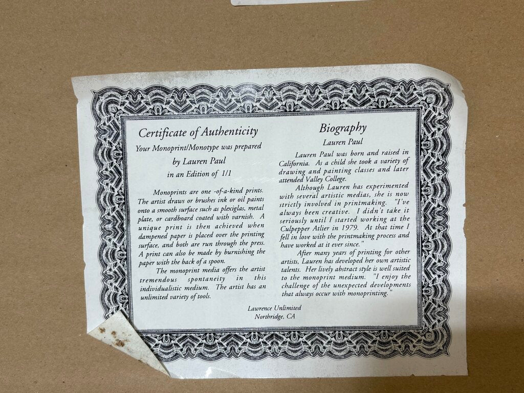 Lauren Paul "Spanish Flower" Original Mono Print Signed w/ Cert on Back