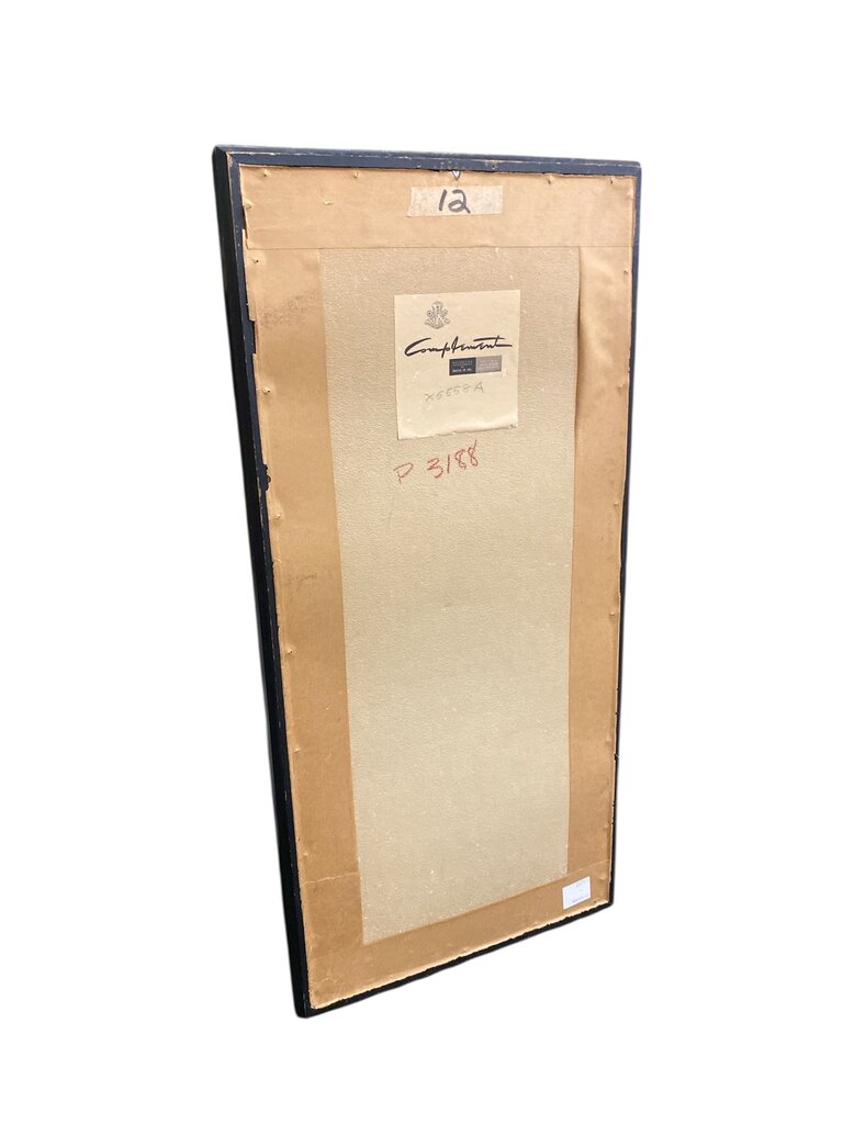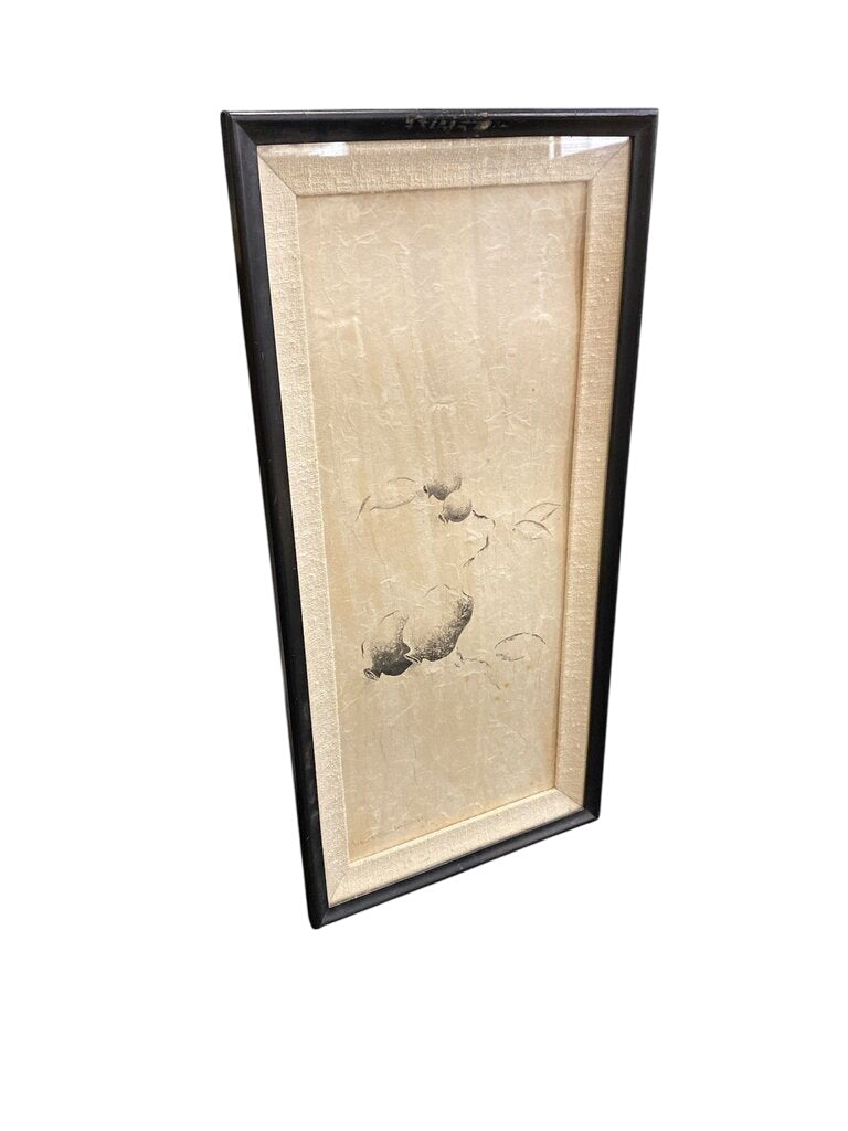 Original vintage pomegranate fiber panel art, mounted on a fiber paper panel and signed. Framed with a light beige inner mat and a black wood frame, the vertical panel features a pomegranate motif and is suitable for display in residential or office settings.