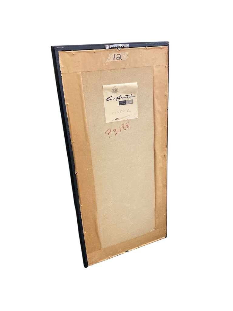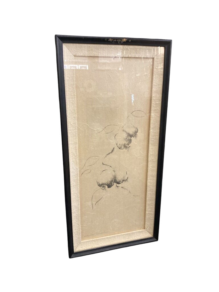Pomegranates On Fiber Paper Signed Panel is a framed botanical artwork created on a textured fiber paper panel. It is presented in a black wood frame with a light beige inner mat, signed on the panel (Signed Panel) and cataloged by Miss Daisy's Consignment & Auction House as the vendor.