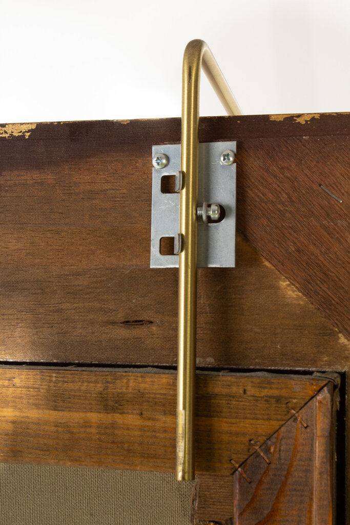Description: Portrait signed by Eagleson and framed, with included picture light. Frame: Frame w/ lamp: 34"x29"x4" Artwork: 24"x20" Cord length: 30" Condition: There is a small blemish in the corner of the artwork, minor distressing or wear to the frame, and the lamp has small scratches and tarnishing to the hood and armature, but IS in working condition.