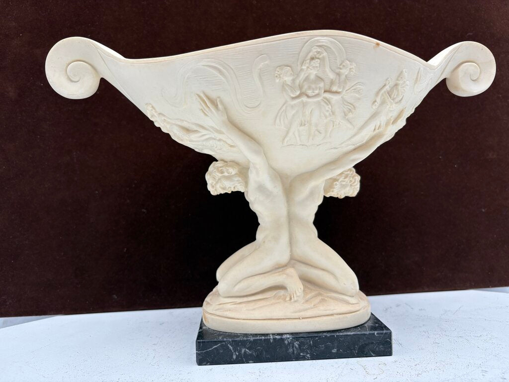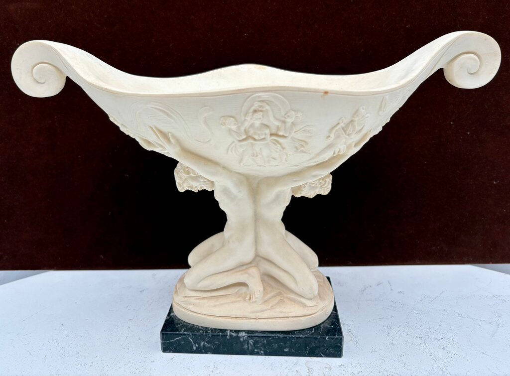 8.8"H x 13.3"W x 7.5"D Excellent Condition Vintage A. Santini Pedestal Compote Bowl "Held by Atlas Men" Plaster Sculpture on Black Marble Base 8.8"