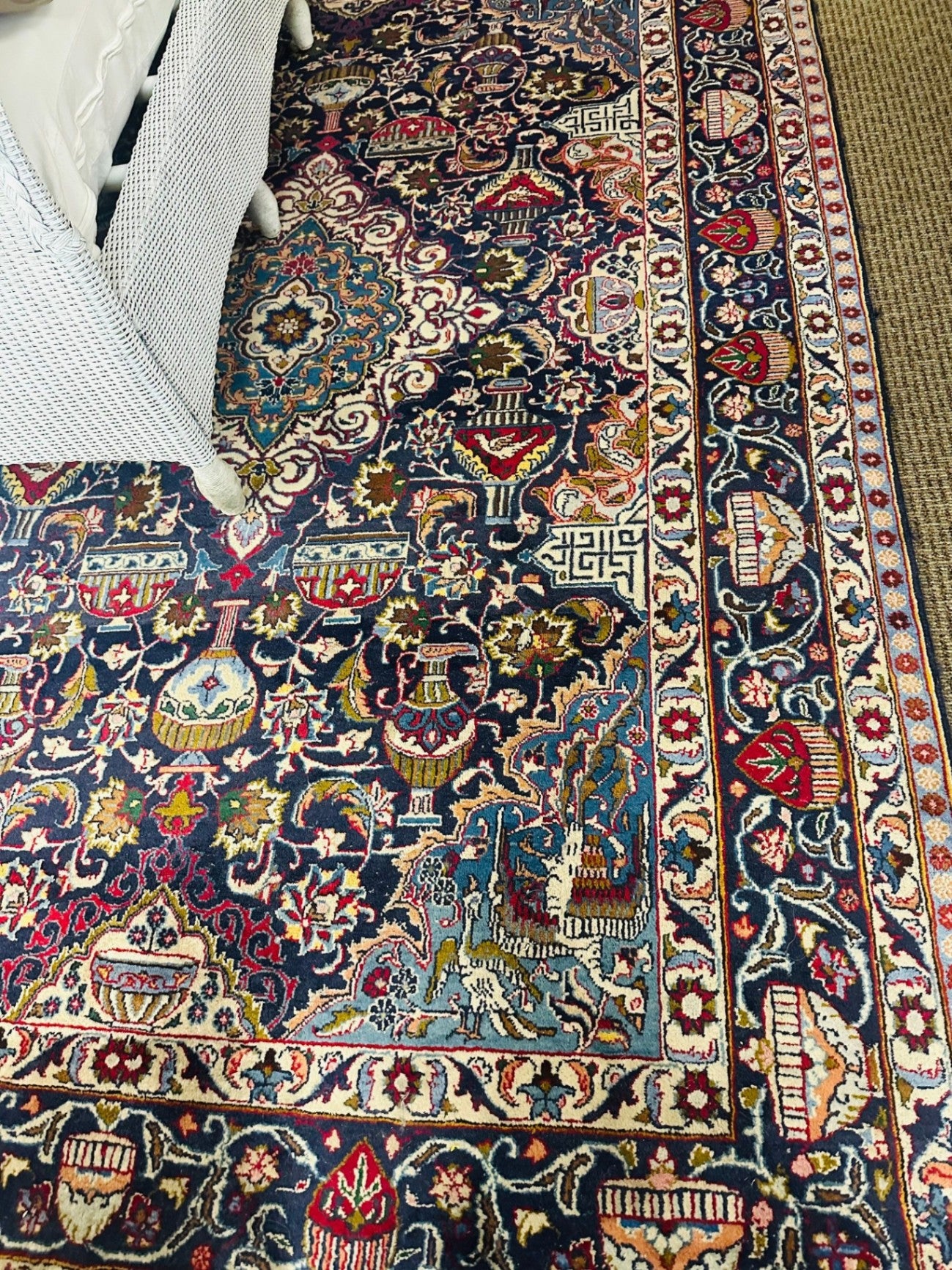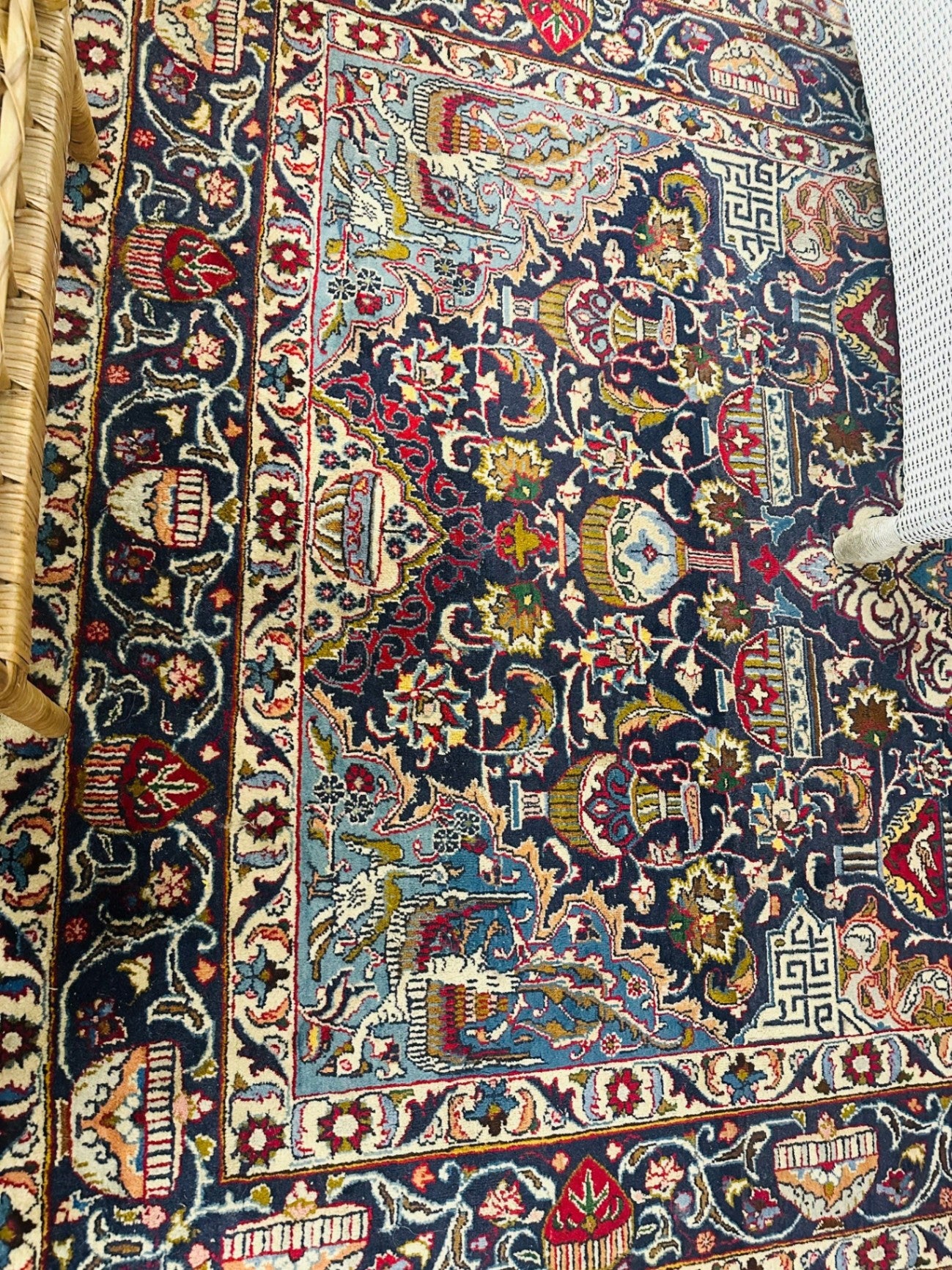This is a traditional Persian-style rug featuring a dark navy blue field with a central medallion and intricate floral and vase motifs. It includes a detailed border with geometric and floral patterns. The rug measures approximately (insert size if known). The design incorporates vivid colors like red, light blue, white, gold, and green, and displays detailed craftsmanship consistent with hand-woven Persian rugs.