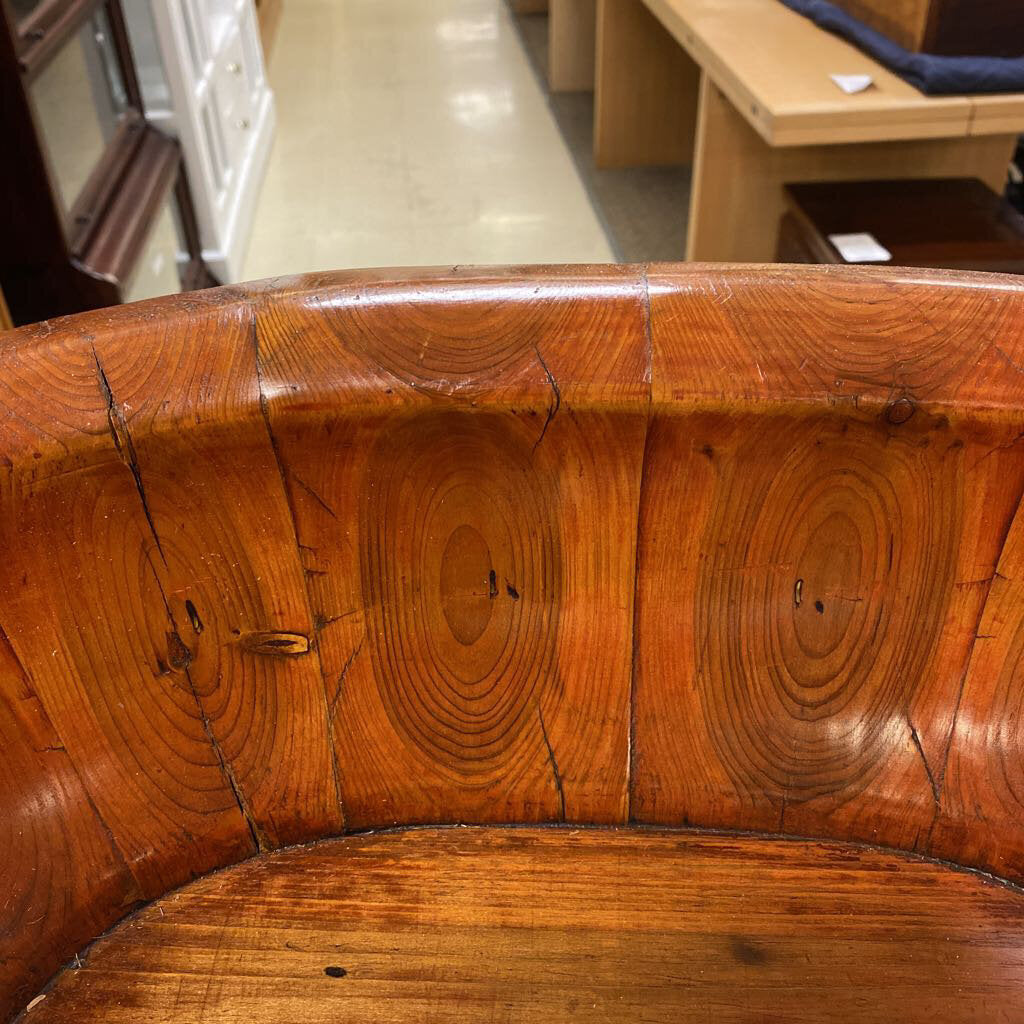 Antiquarian Chinese lacquered solid-wood baby bath. This oval bath is crafted from solid wood and finished with lacquer, featuring metal bands for reinforcement and a warm aged patina. Offered through Miss Daisy's Consignment & Auction House as a resale piece.