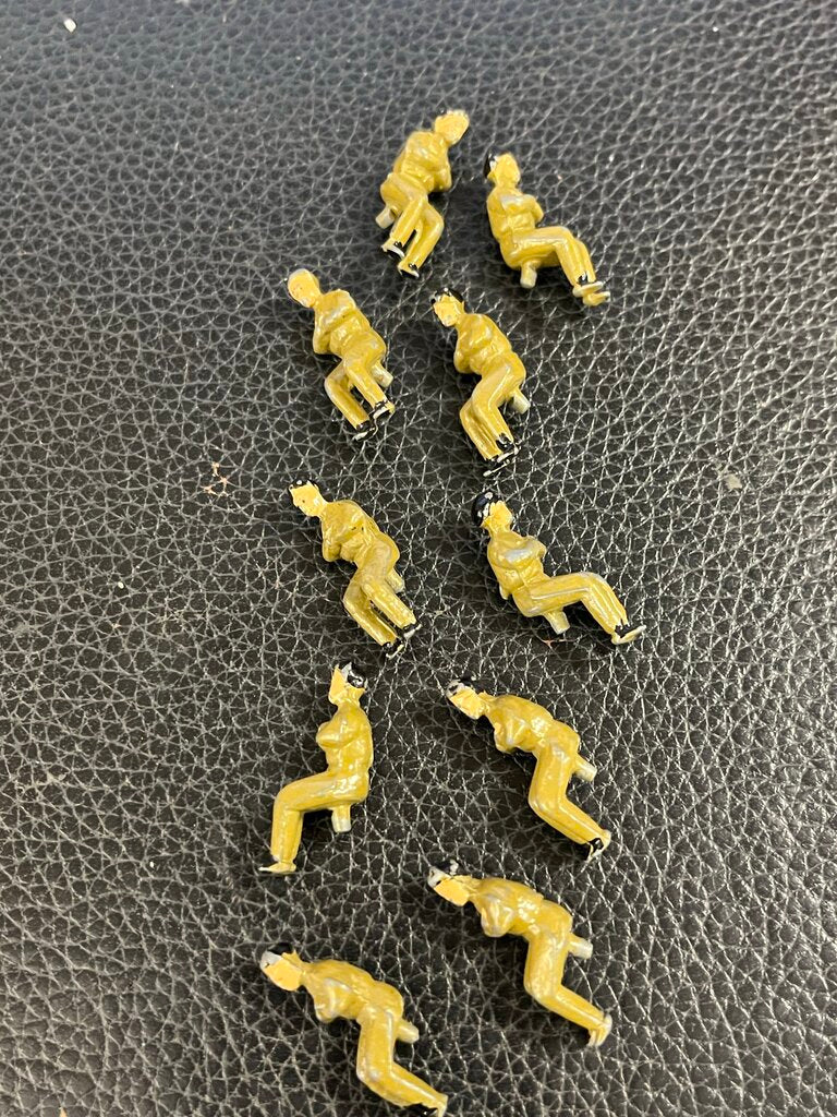 Vintage Dinky Toy 603 Army Personnel Privates Seated (4), a set of four seated military figures in khaki tones mounted on a green base. This consignment item is offered by Miss Daisy's Consignment & Auction House and is used.