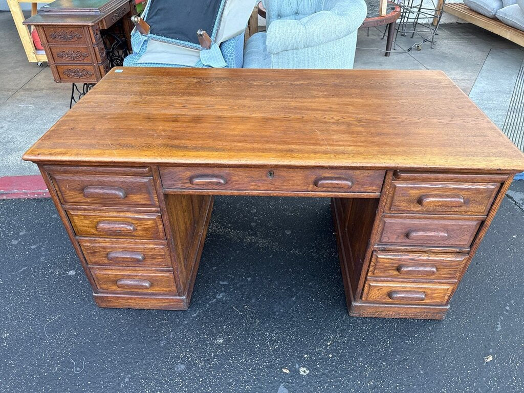 Substantial oak desk with multiple drawers and classic lines, offering generous work surface and traditional appeal.