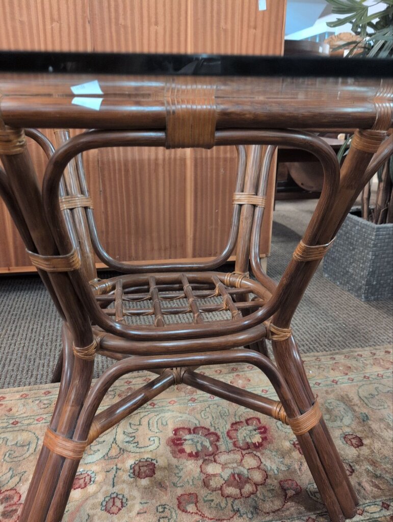 Overview Oval glass top dining table with a sculptural bamboo base. Suitable for use as a dining or breakfast table. Specifications Dimensions: 60 W × 46 D in Materials: Glass, bamboo Features • Oval clear glass tabletop • Bamboo pedestal-style base • Open base design allowing legroom Condition / Notes Pre-owned. Condition consistent with prior residential use. Shipping & Handling Miss Daisy's does not offer in-house shipping, but we have local partners who can pick up your purchase and ship it to you. Please see the Delivery Services tab on our home page.