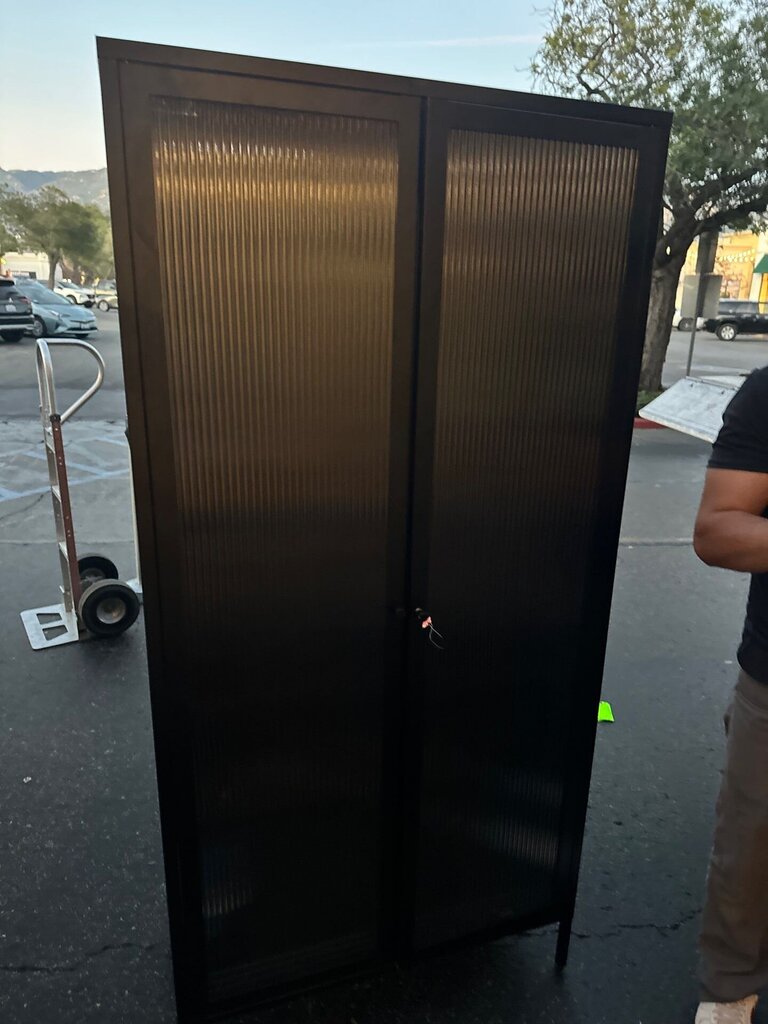 Contemporary Metal and Glass Doors Display Cabinet. A great addition for home styling and everyday function. Approx. 36 W 16 D 73 H in.