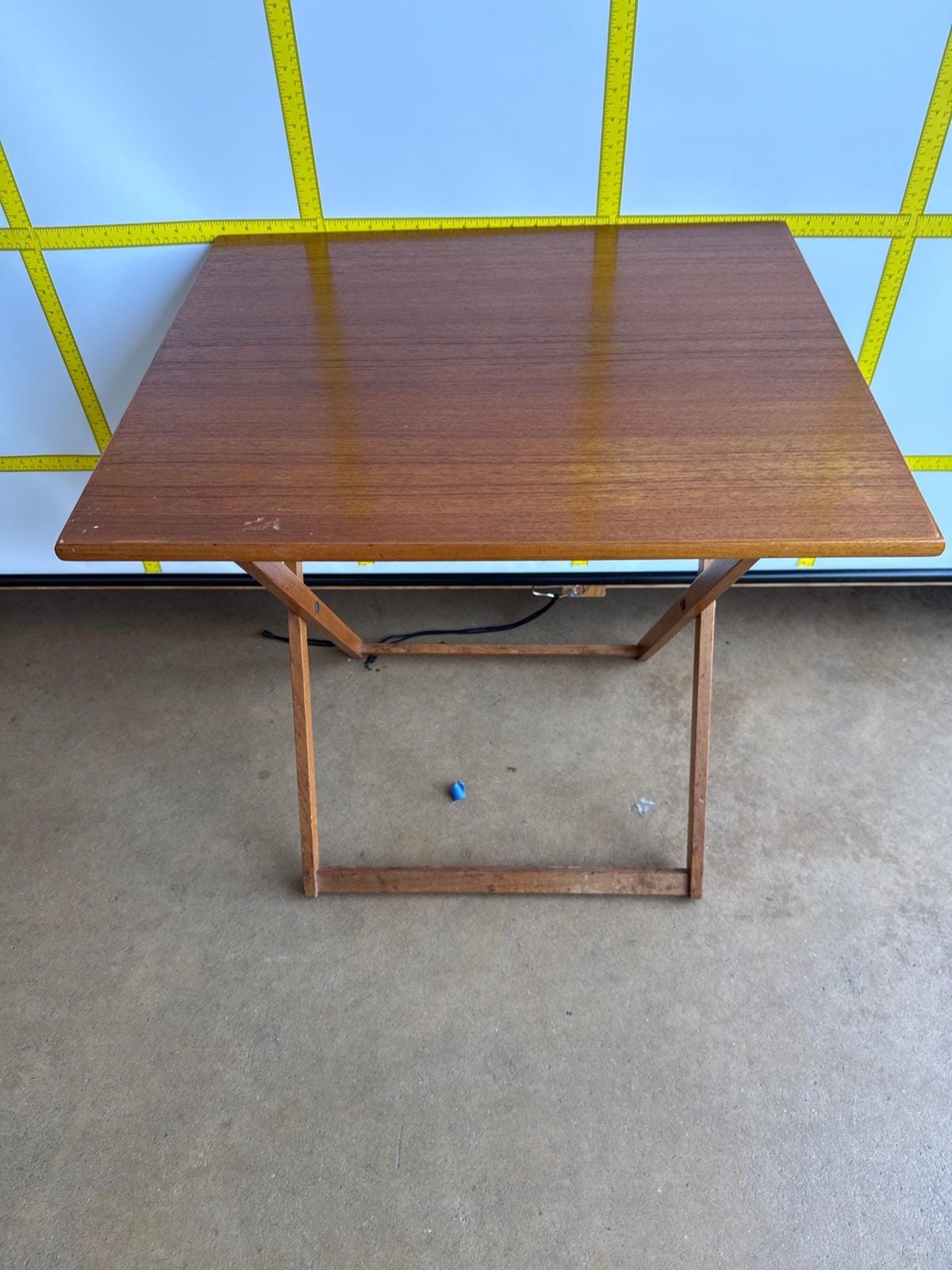 A Danish mid-century folding table attributed to BRDR Furbo, featuring a compact square silhouette with a fold-flat mechanism. It stands 24 inches tall and 24 inches wide, and folds to a slim 1 inch in depth for easy storage. This piece is suited as an unobtrusive side surface, a small workspace, or an auxiliary surface in compact living areas, reflecting the era’s emphasis on clean lines, functional form, and versatile use in everyday interiors.