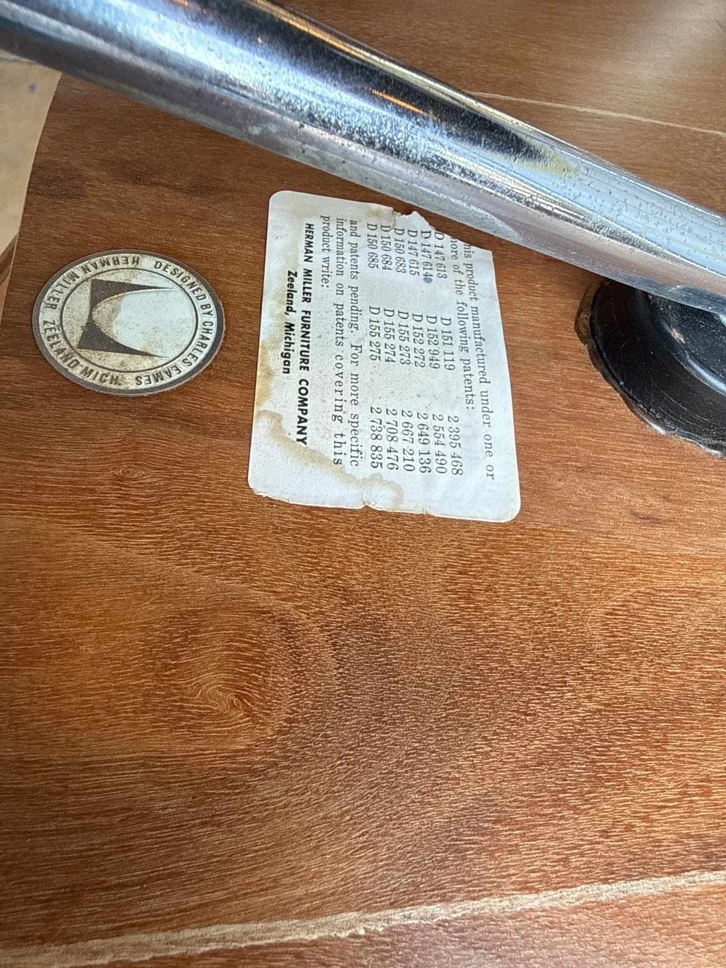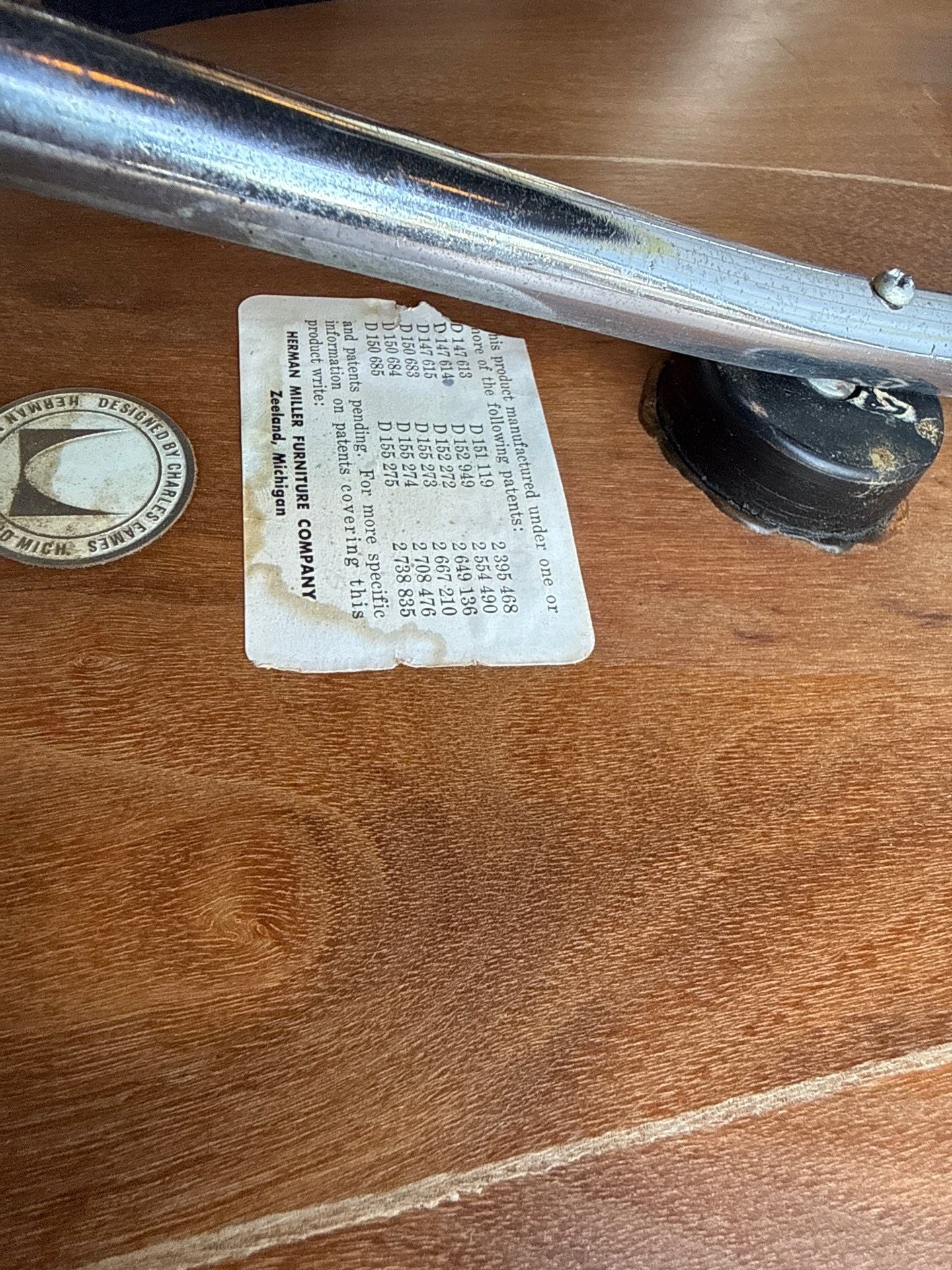 Pair of Herman Miller Eames chairs, each bearing original labels on the underside that confirm their origin. This set reflects mid-century modern design through a clean, sculpted silhouette and restrained hardware, offering versatile seating for dining spaces, home offices, or collaborative areas. The chairs embody the era’s emphasis on functional form and ergonomic comfort, fitting well within a refined resale environment that values provenance and durable construction.