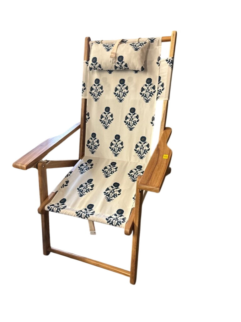 Tommy Bahama lounge chair with patterned fabric seat.