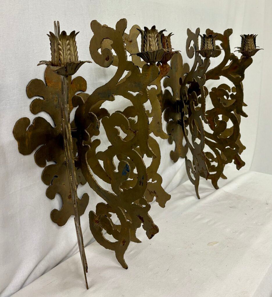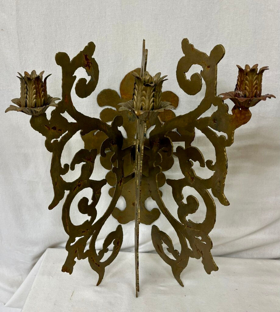 21.5"H x 16.5"W x 11.75"D Good Condition Custom Hand Made Plasma Cut French Style Bronze Finish 3 Candle Wall Sconce (PAIR)