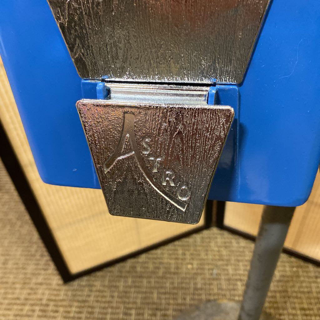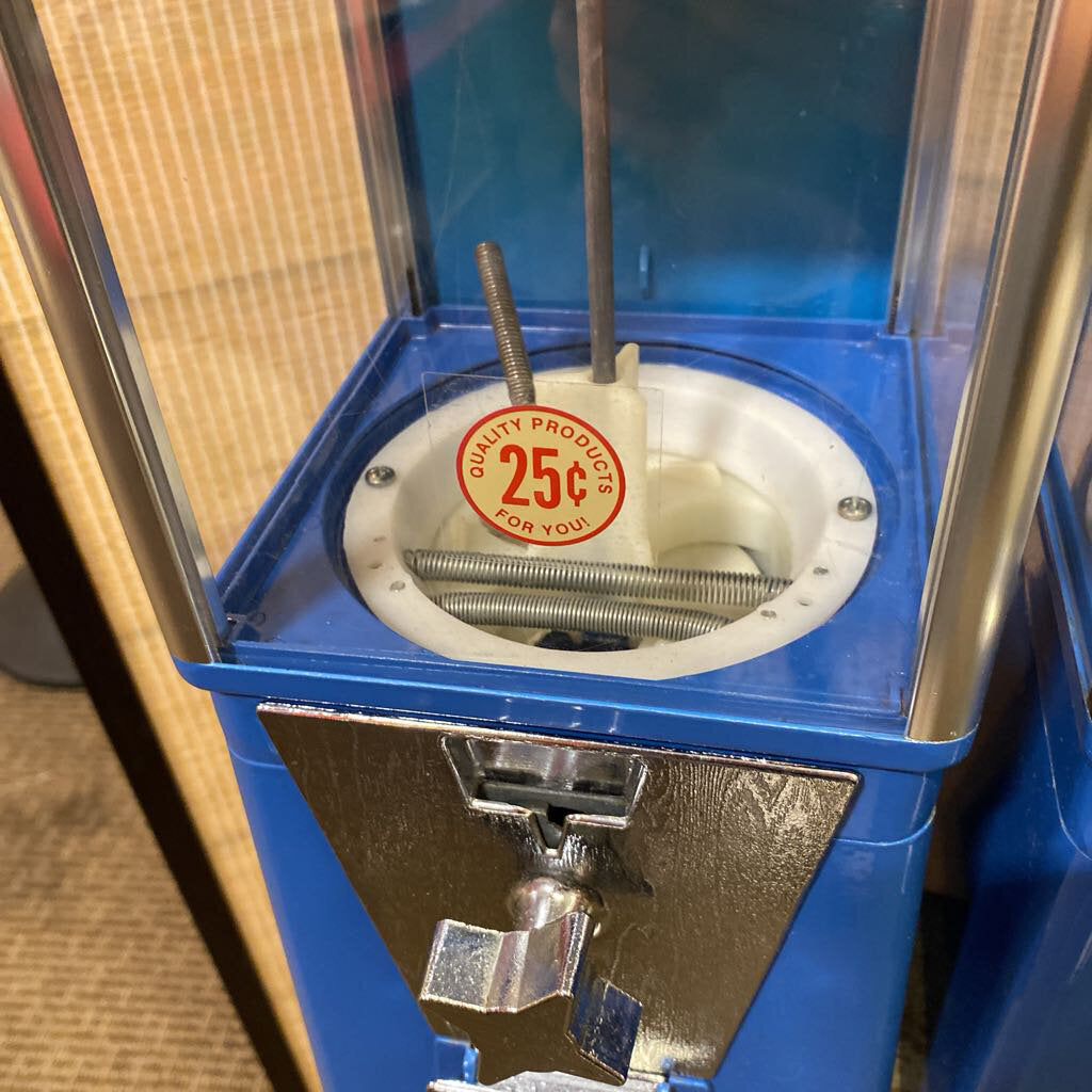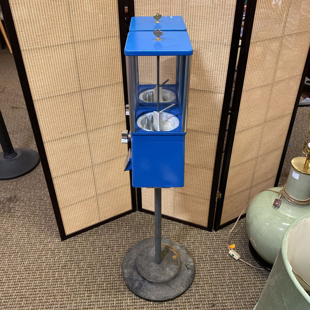 SpecificationsDual blue metal housings frame two vertically aligned dispensing heads, each with a clear viewing panel that reveals the contents and mechanism. The heads are paired on a single pedestal, creating a balanced, symmetrical silhouette with a utilitarian, mid-century commercial-machine vibe. Front-access chutes and coin mechanisms contribute to the piece’s functional character, while the brushed metal accents on the panels provide contrast against the bold blue finish.