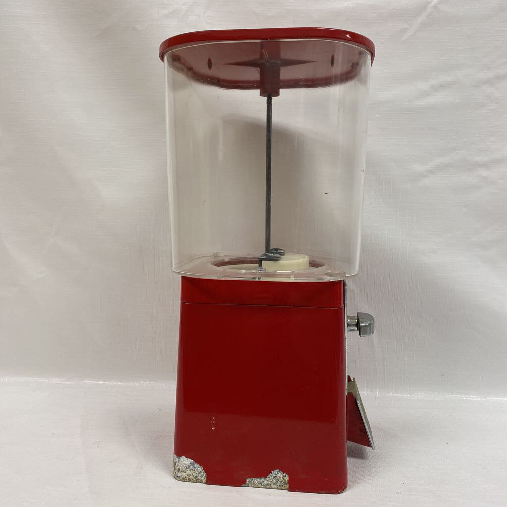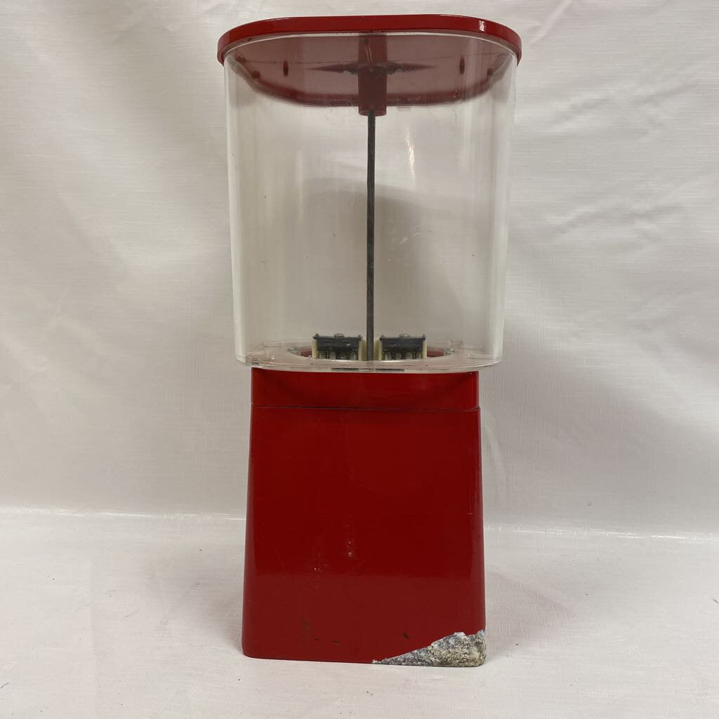 Vintage red gumball dispenser featuring a clear globe and a coin-operated mechanism. The base is red metal with chrome front hardware, and the transparent globe allows visibility of contents and remaining treats. Designed for dispensing gumballs or small candies from the globe, the unit presents a compact vertical profile suitable for desks, counters, or game rooms.