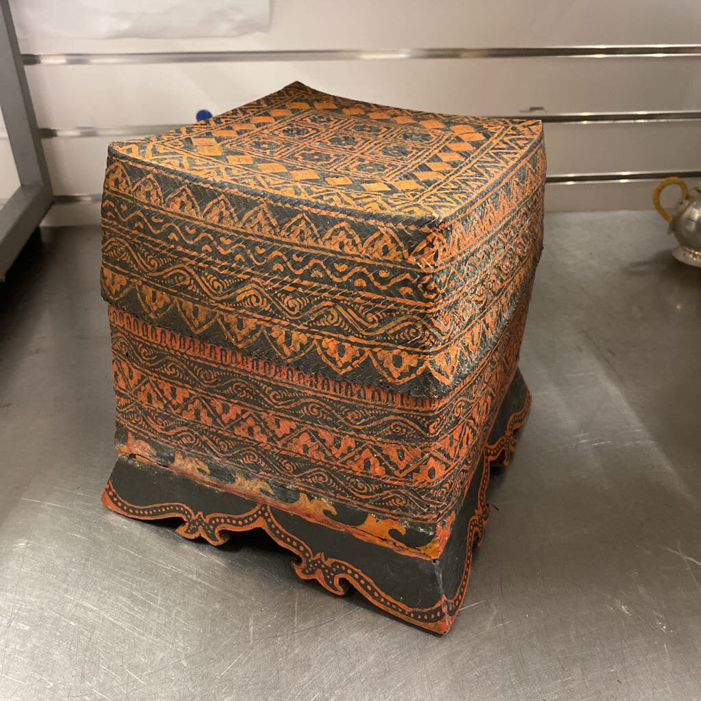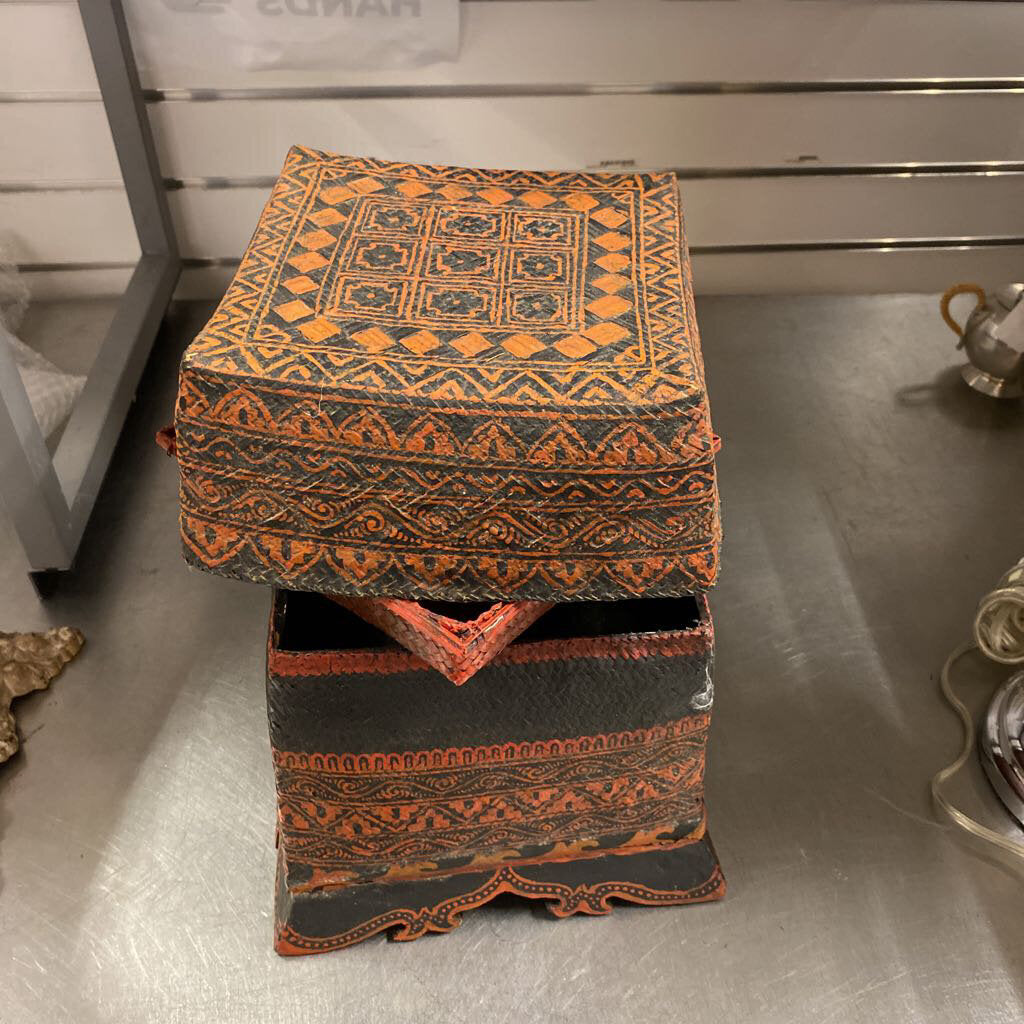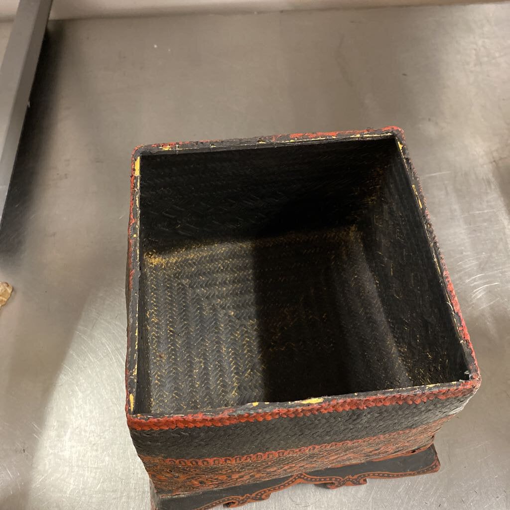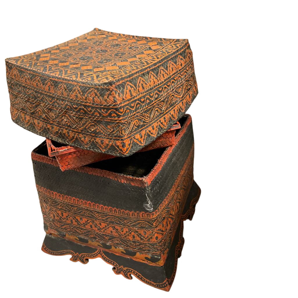 SpecificationsNotable visual characteristics include a square form with a hinged lid, woven wicker construction, and a red and black lacquer surface that showcases geometric patterns along the edges. The piece emphasizes clean lines, balanced proportions, and craftsmanship evident in the precise weaving and edge detailing, resulting in a versatile object that reads as both functional and decorative.