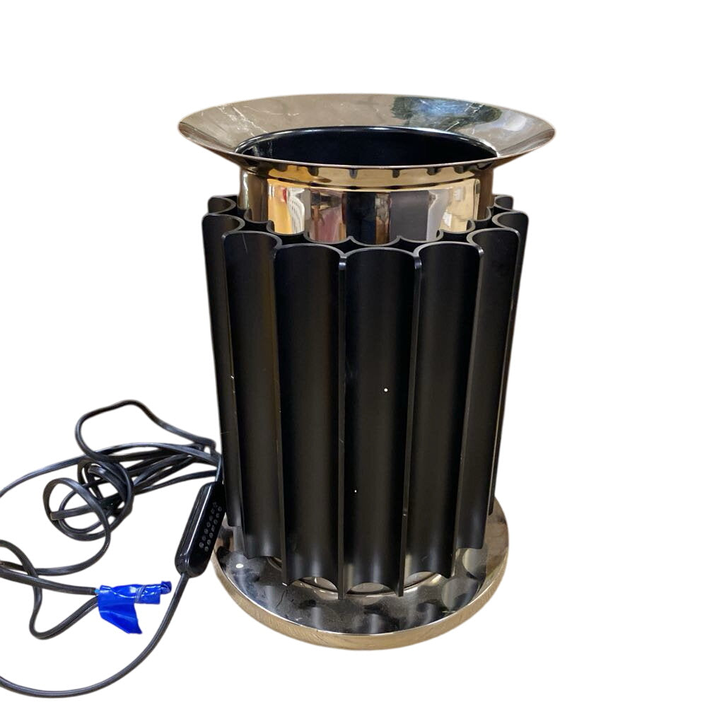 Flos Taccia lamp base (base only) offered by Miss Daisy's Consignment & Auction House. The piece presents a chrome ring at the top with black vertical fin-like panels forming a cylindrical motif around a central core. This base requires rewiring to be functional.