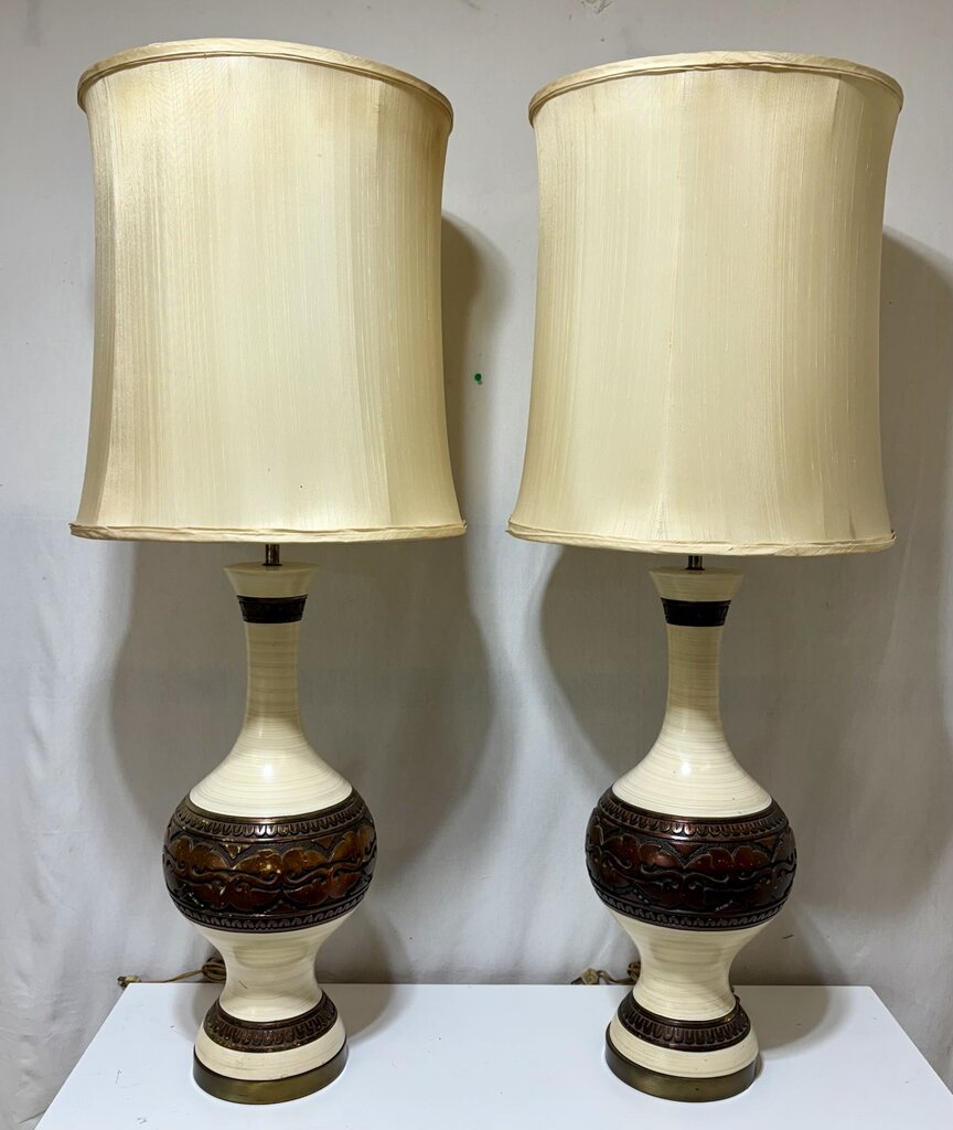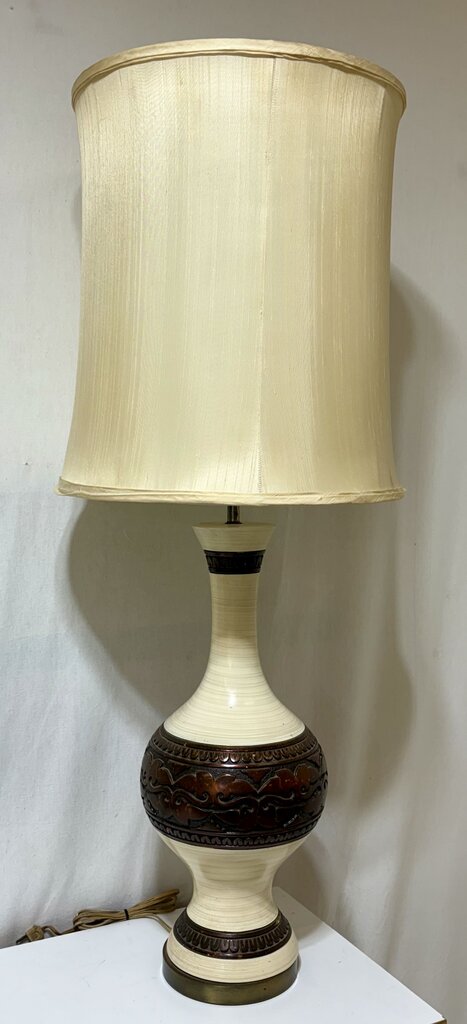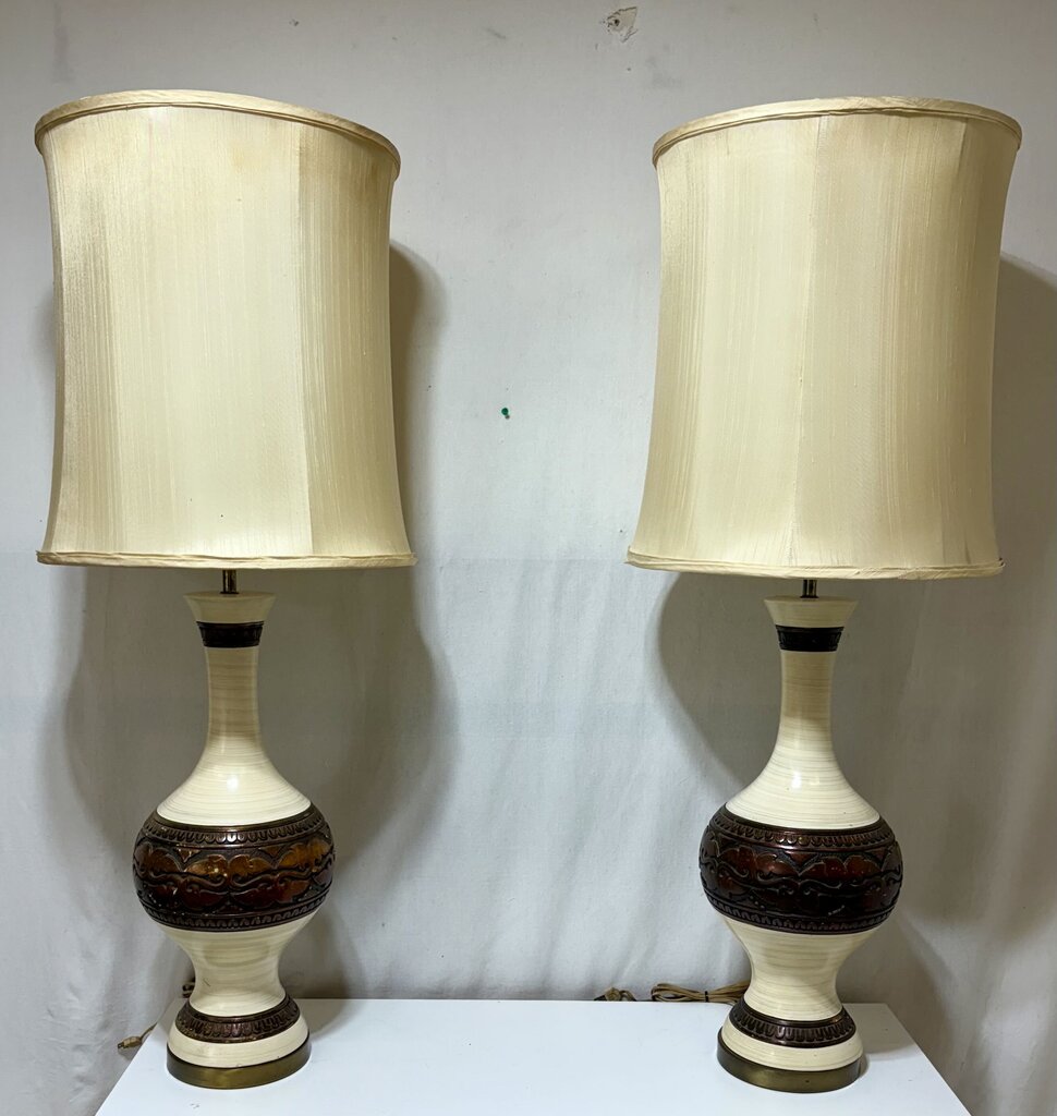 Over All: 43.5"H x 17.25"Dia. Silk Shade x 9.25"Dia. Ceramic and Brass Body Good Working and Aesthetic Condition Fortune Lamp Company 1964 MCM Genie Bottle Ceramic Table Lamp (PAIR)