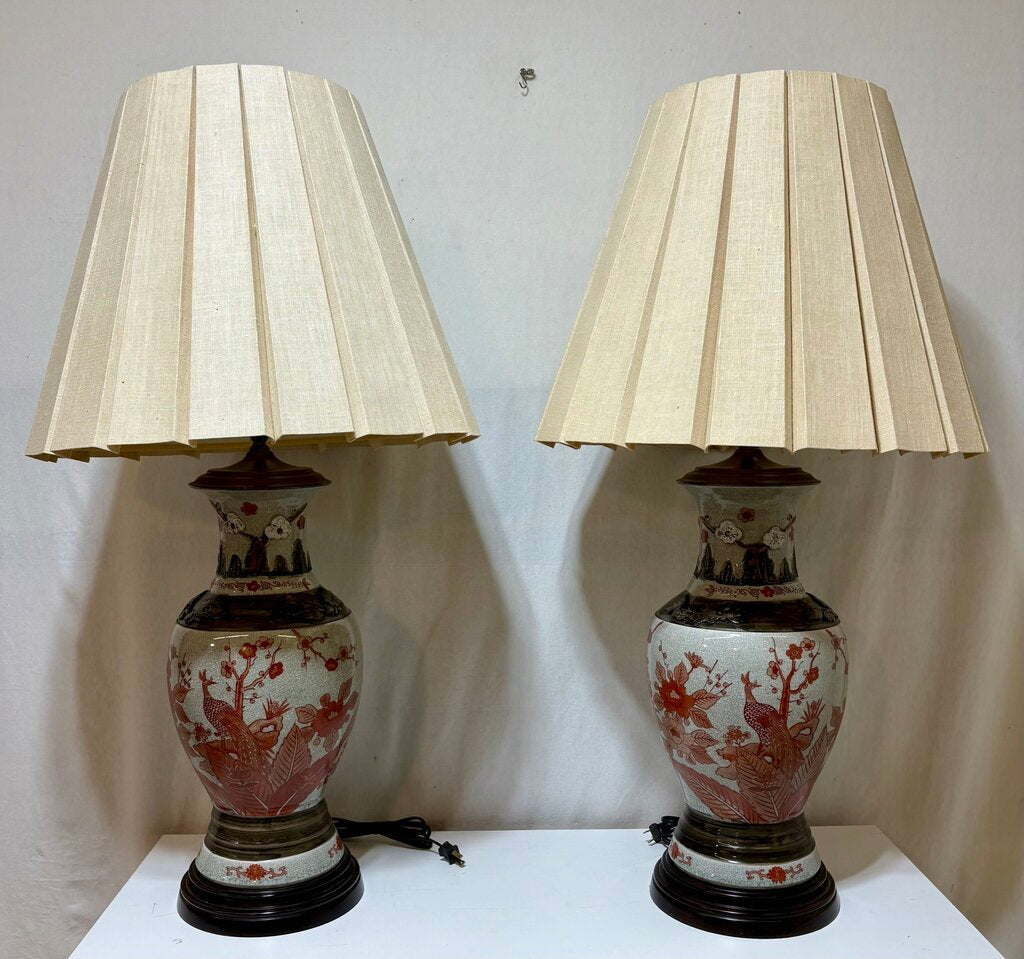 MCM Japanese Kutani Style Raised Relief Floral Ceramic Crackle Glaze Vase Table Lamp (PAIR)