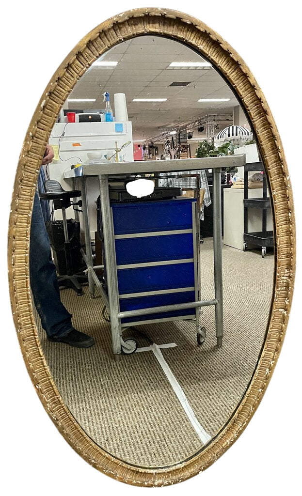 French-style oval mirror with a carved wood and plaster frame finished in gilded detailing. Offered by Miss Daisy's Consignment & Auction House, this large wall mirror adds classical presence to interiors while serving a reflective function.