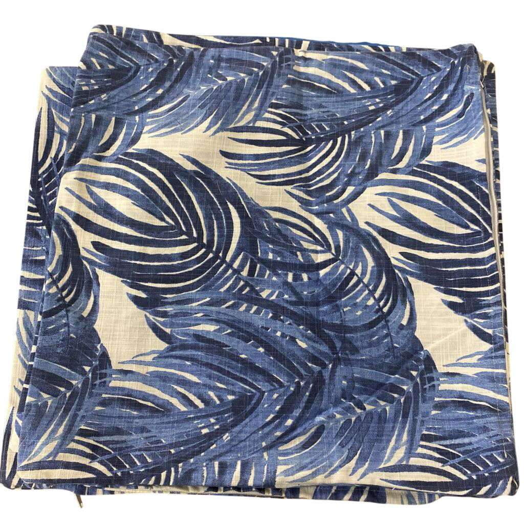 Palm Leaf Throw Pillow Cover measures 17 inches square and features a palm frond motif rendered in indigo blue on a white ground. The design references botanical and coastal aesthetics with bold, overlapping forms that suit contemporary interiors, offering a versatile accessory for sofas, chairs, or beds.