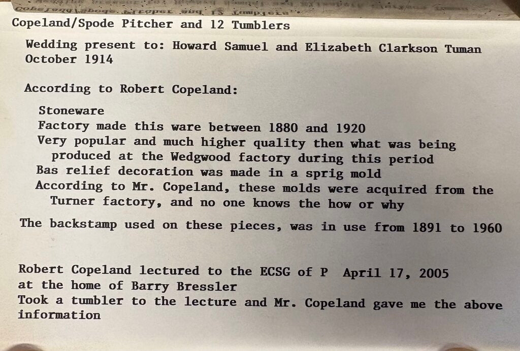 12- Tumblers 4"H x 2.8"Dia. 8oz. Pitcher- 6.5"H x 7.3"W x 5.8"Dia. Body 2Qt. Very Good Condition No Chips Cracks or Flaws Turn of the Century Antique Copeland Spode England Blue Sprigged Tavern Scene Jasperware Pitcher & Tumbler Set (13pcs)
