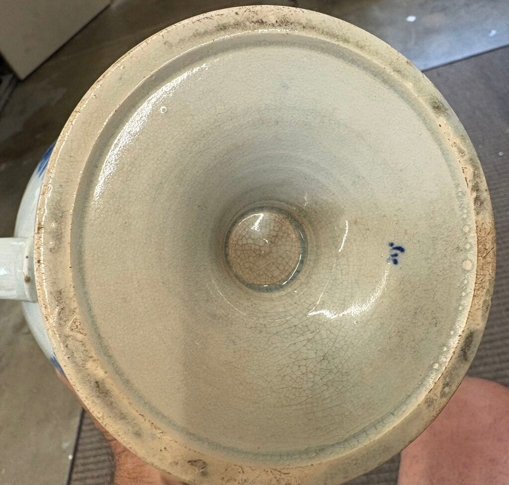 9.5"H x 11.3"W x 6.25"Dia. Fair Condition, previous crack repair and no Lid for this Early 19th C. Staffordshire Blue White Pastoral Scene Coffee Pot