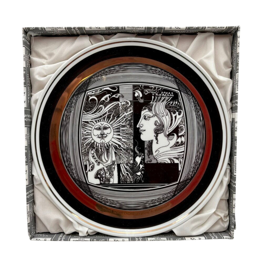 Decorative porcelain plate from Hollóháza, Hungary, featuring the Sunshine motif with a black-and-white sun and a profile, accented by a gilt rim. The design is attributed to Endre Szász; the plate measures 9.75 inches in diameter and 0.75 inches deep and arrives in a satin-lined presentation box for display.