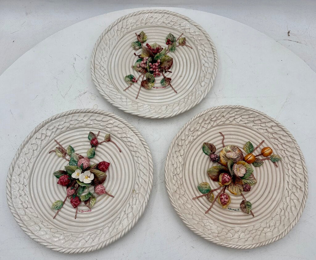 1.25"H x 9.6"Dia. Undulating Asymmetrical Shape with Individual Floral Berry Motifs Excellent Mint Condition Flawless No Chips Signed Italian La Luna Del Pozzo Studio Barbotine Majolica by Benedetti 1960's Hand Made Plate Set (3Pcs)