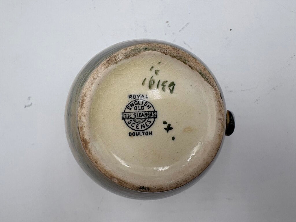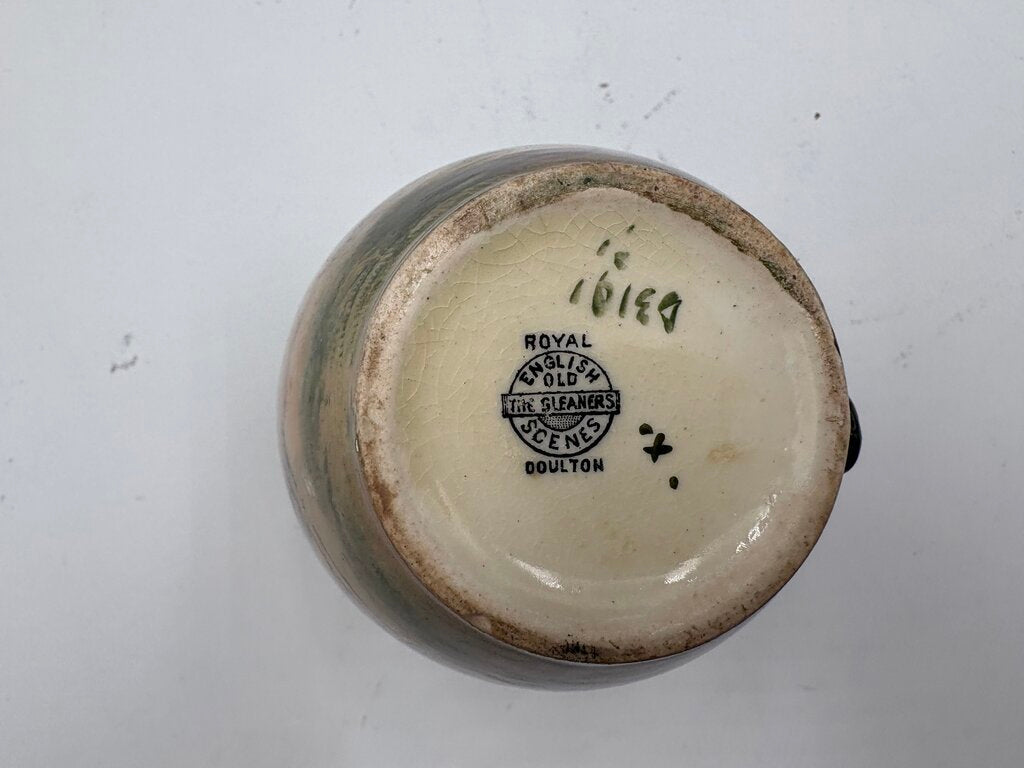 4.25"H x 4.25"W x 3.25"Dia. Fair Condition Minor Chip & stabilized small adjacent crack for this Royal Doulton Old English Scenes The Gleaners Creamer Pitcher