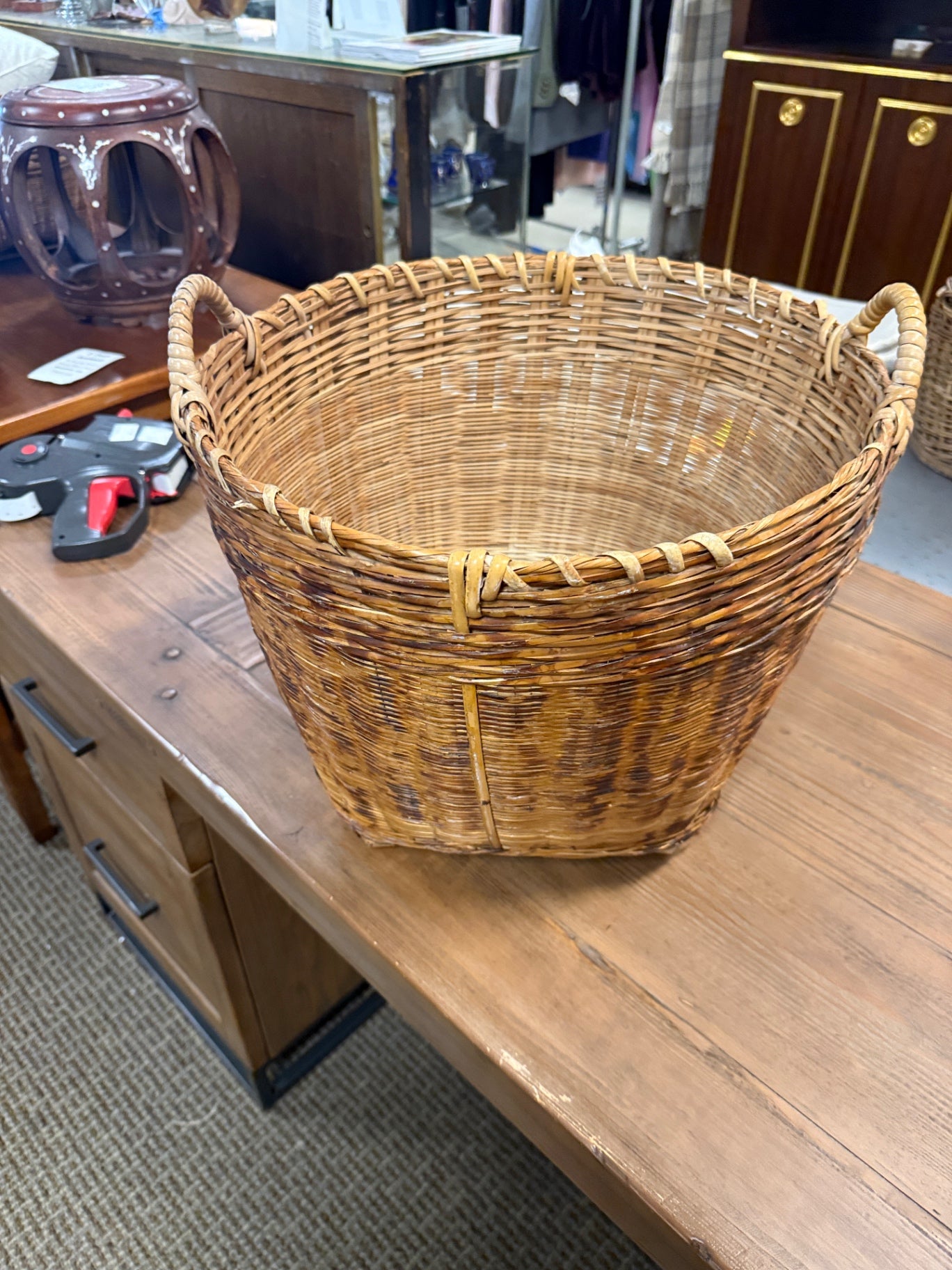 A French wicker basket, perfect for storage and organization. Made of natural wicker with a durable construction.