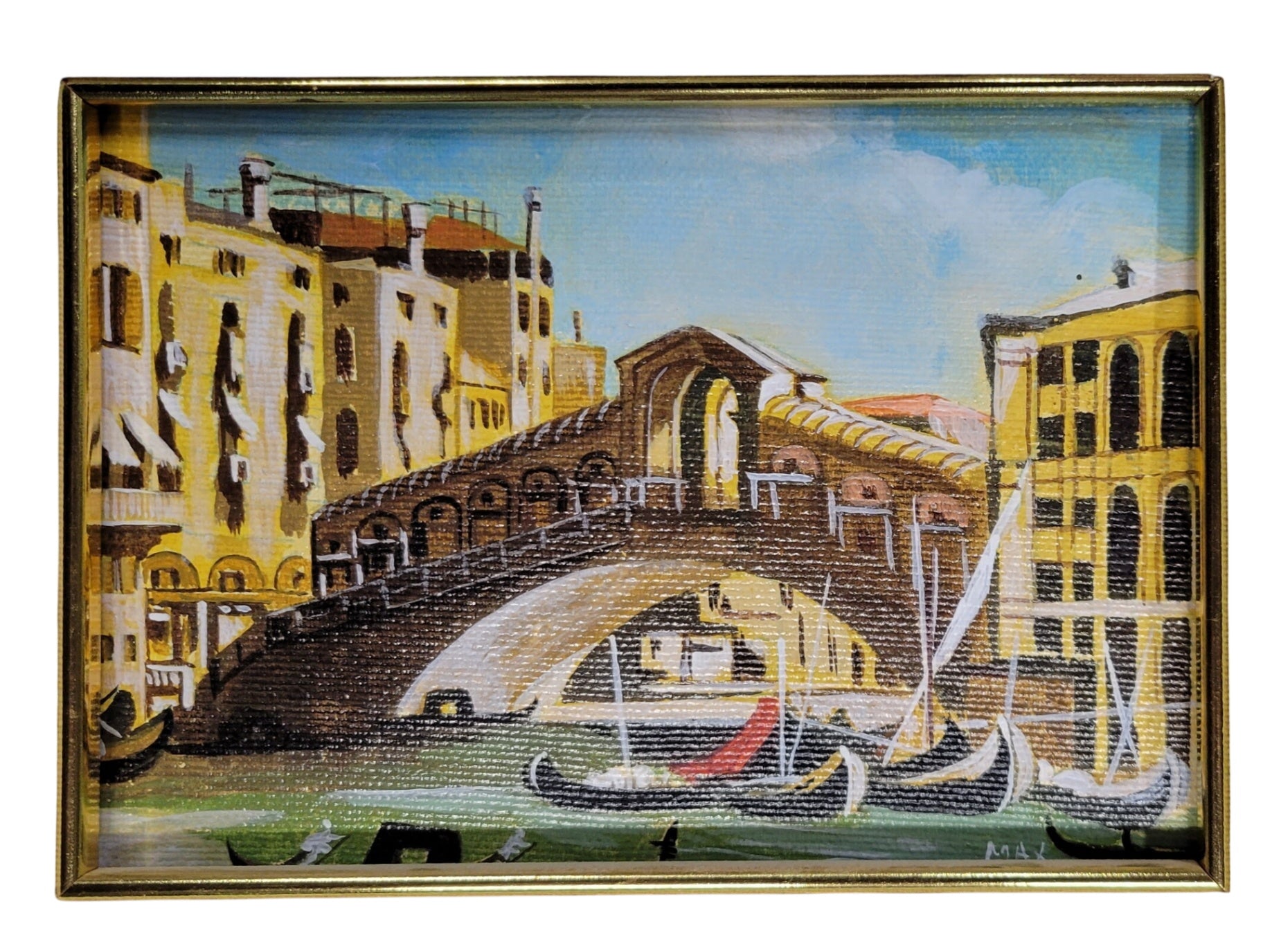 The image shows the back of a framed canvas artwork, with the wooden frame and hanging mechanism visible. The frame is constructed from pine wood, with handwritten text indicating it is from Max Venezia, with a size of 200 cm. The back is reinforced with staples and includes a hanging string secured with staples around the perimeter of the back frame, used for mounting on a wall. The outer frame appears to be aged with a distressed finish, while the inner frame is in natural wood, designed to support a canvas or similar surface for decorative purposes. No other materials or adornments are visible in the image.
