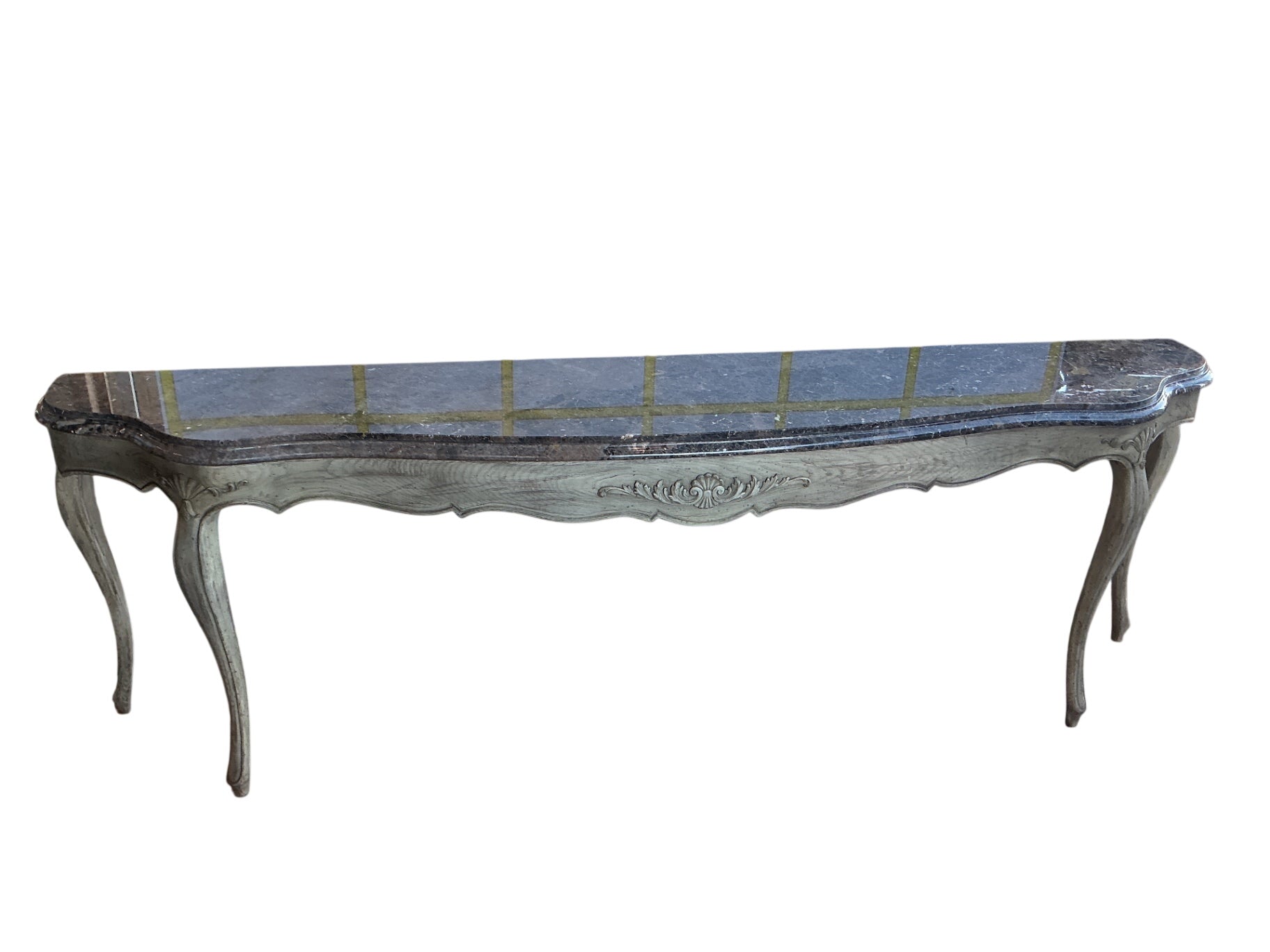 A vintage-style console table with a wooden frame featuring carved detailing, finished in a distressed gray paint. The tabletop appears to be made of dark marble with a polished surface, showcasing natural veining. The table has cabriole-style curved legs and an ornate apron with decorative carvings. Measurements are not provided. The condition shows some signs of wear consistent with age, including possible minor chips or surface imperfections in the painted finish and marble top.