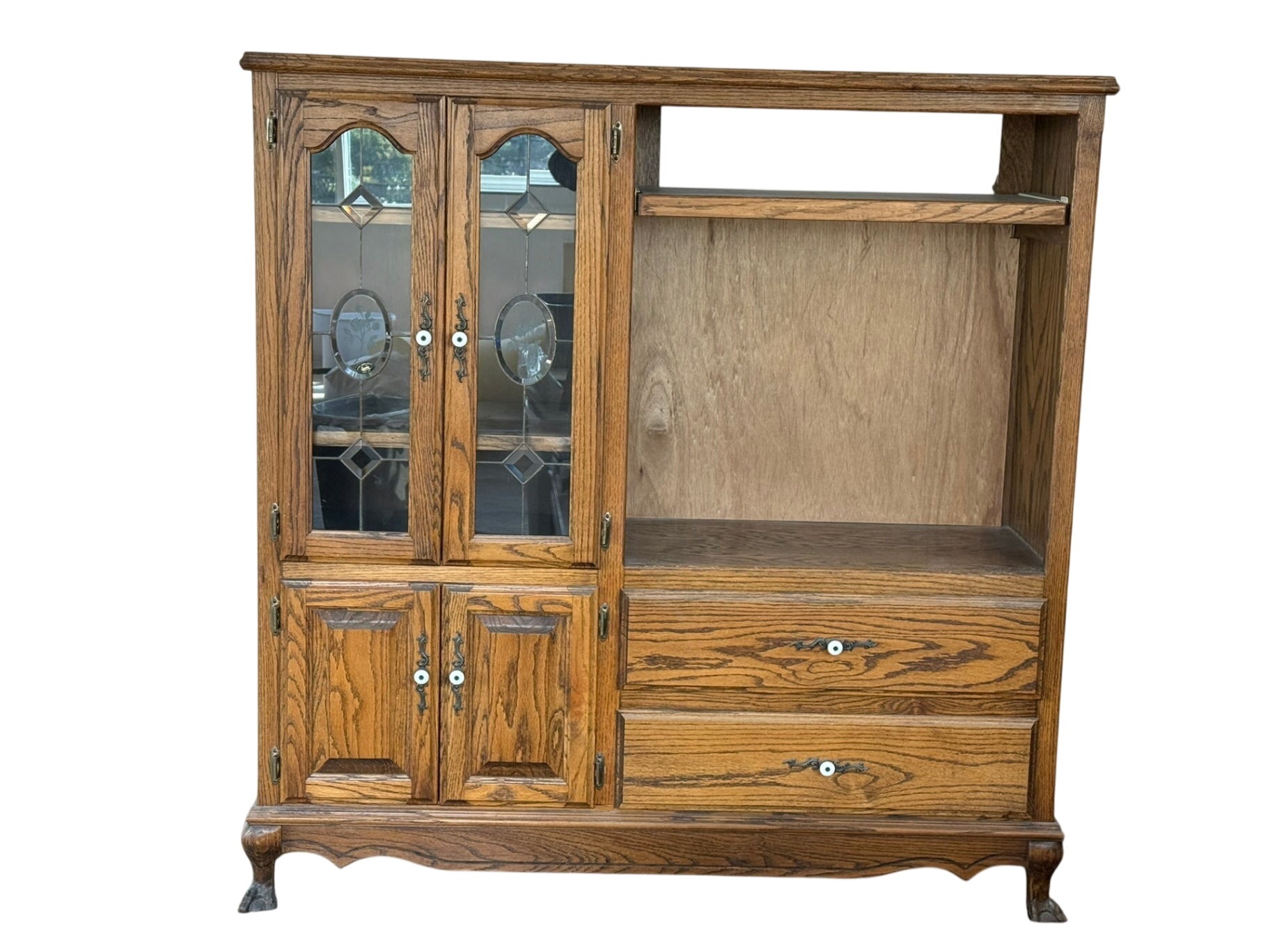 Wooden entertainment or storage unit with glass-paneled doors, drawers, and open shelving. Features decorative hardware and a traditional design with carved detailing on the feet and edges. The piece appears to be constructed primarily of wood with glass inserts in the upper doors and metal hardware for handles and hinges. It has a rectangular shape designed for use as a media console or display cabinet, with multiple storage options including glass-doored cabinets, drawers, and open shelving for electronics or decorative items.