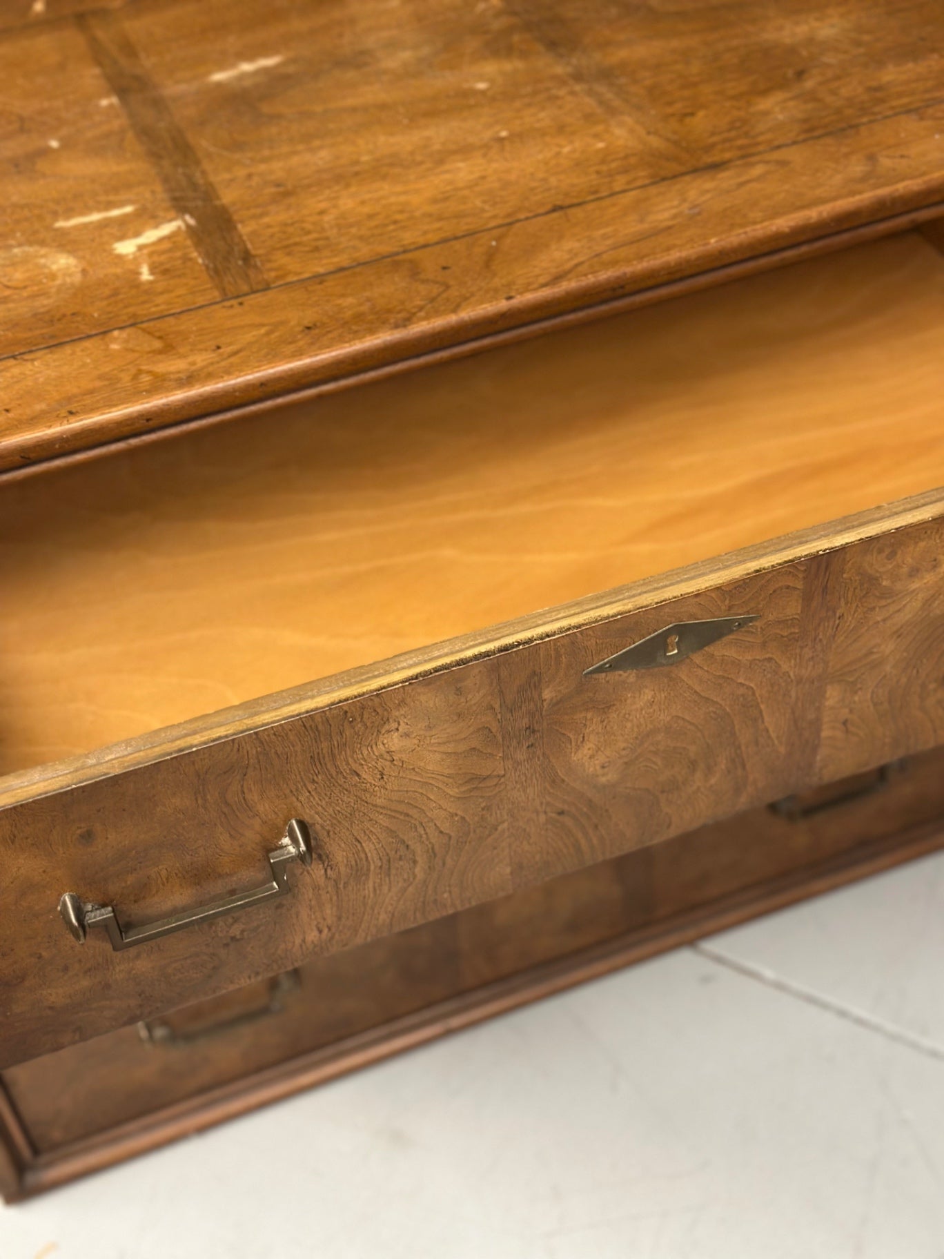 A tall boy dresser from the 1960s, made of wood with a classic design and multiple drawers for storage.