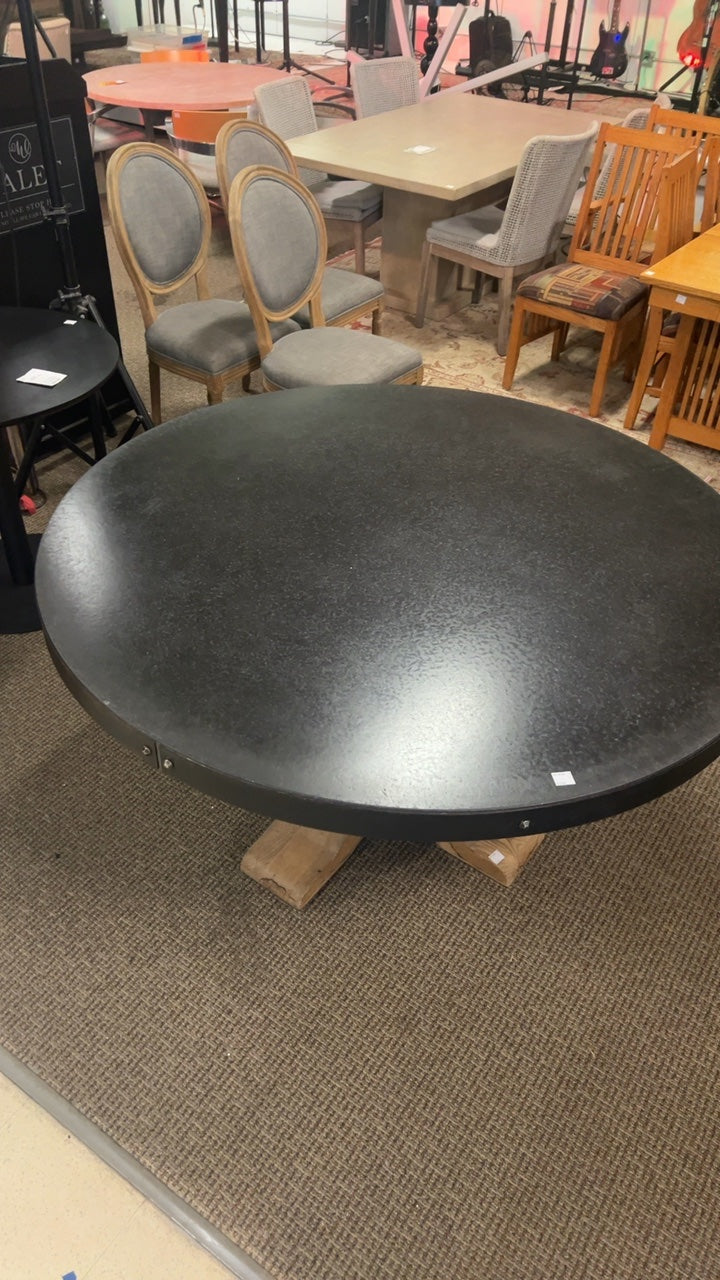 Characteristic trestle base design with a distressed finish for a rustic look. Clean lines and sturdy construction.