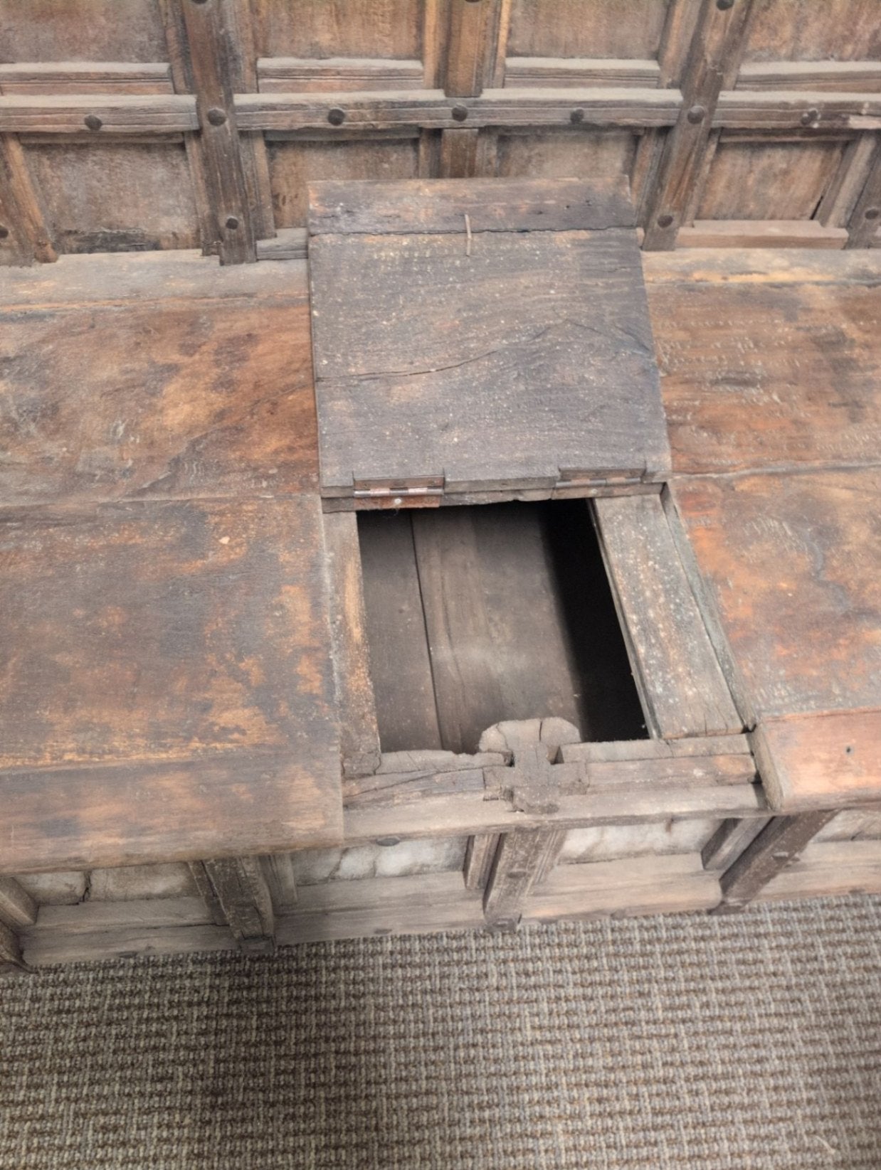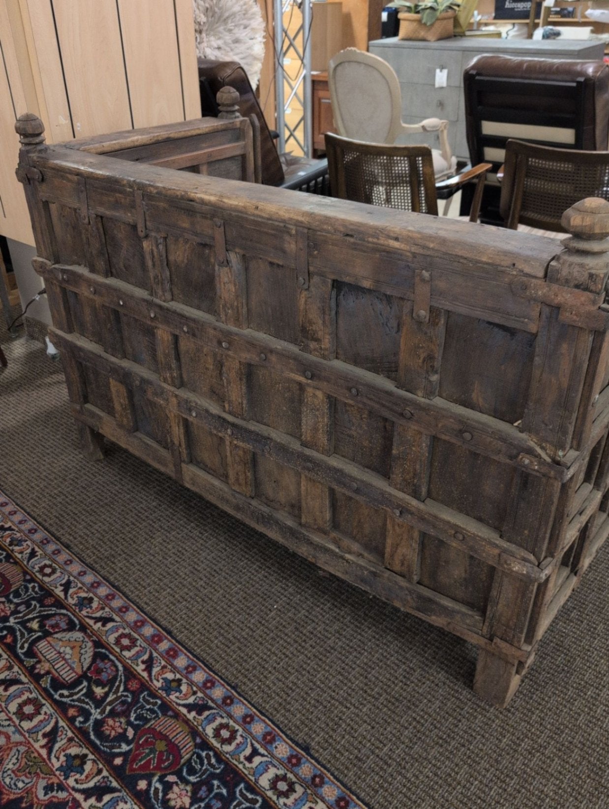 This Reclaim Wood Door Sofa Bench is a unique piece constructed from reclaimed wood doors. It features a rustic design with visible character marks, showcasing a blend of history and craftsmanship.