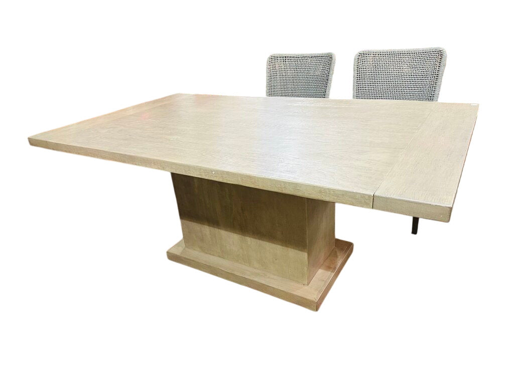Blonde wood pedestal table. Approx. 42.5 in H 72 in W 30 in D.