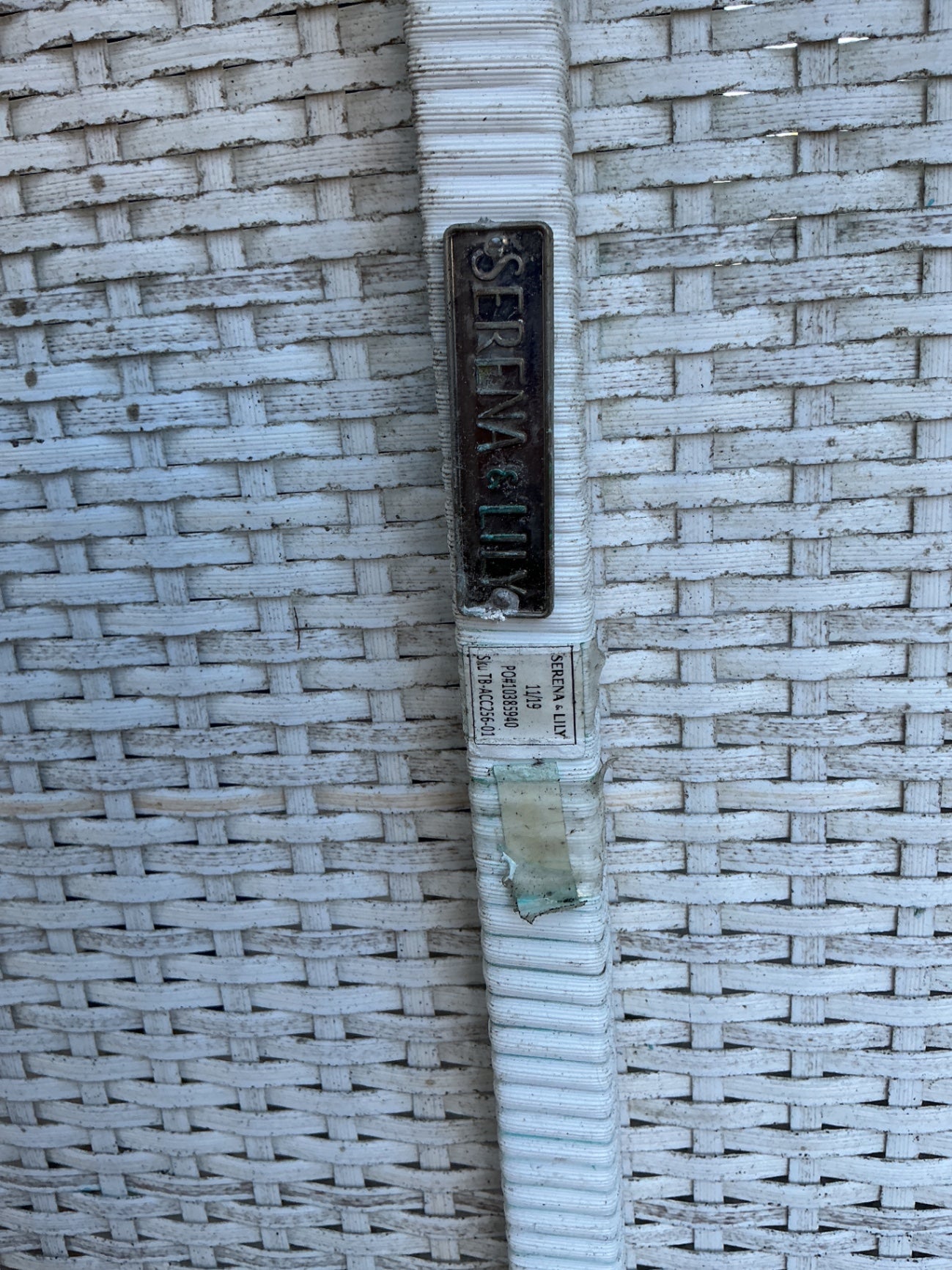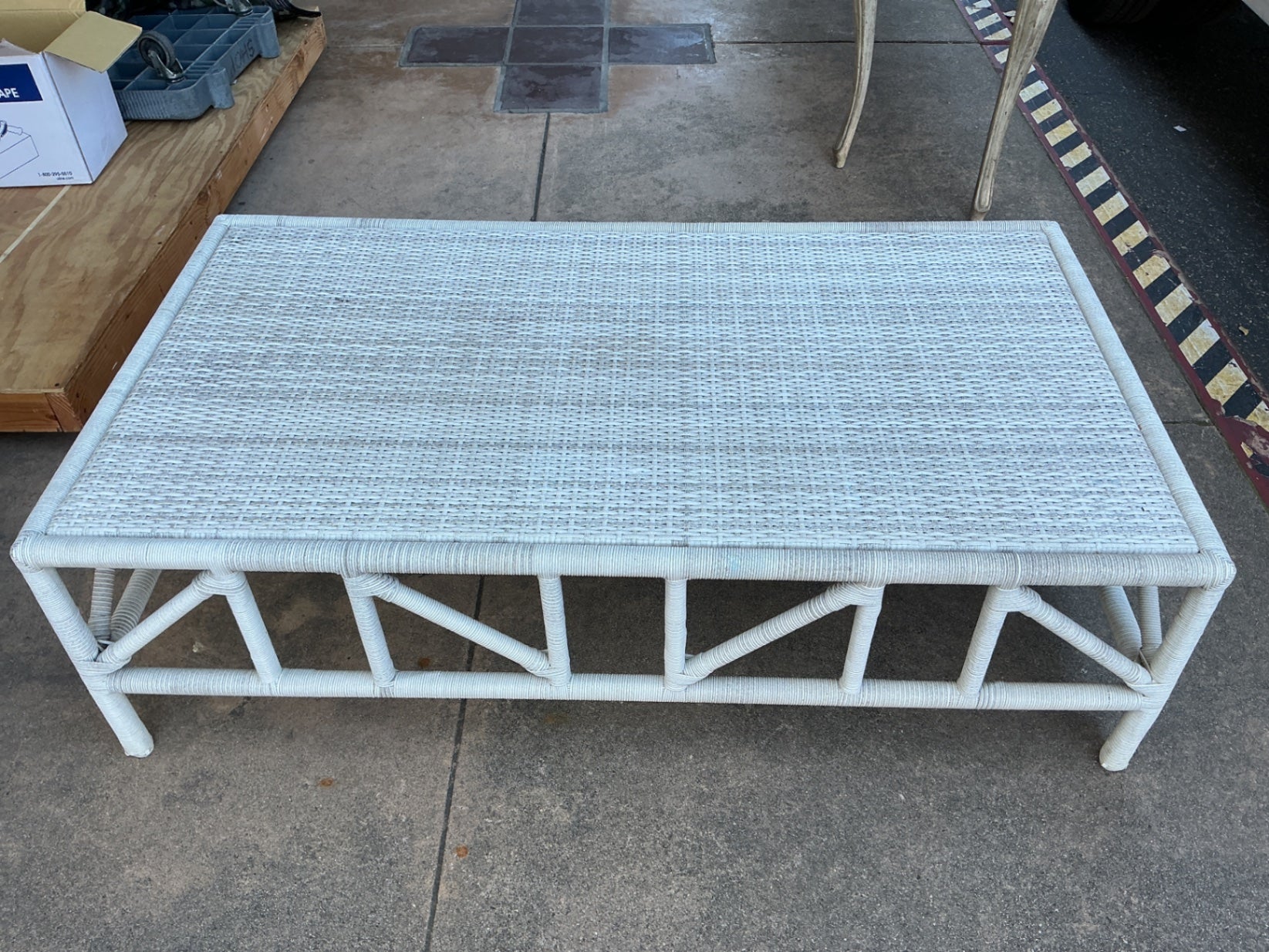 A rectangular outdoor table with a woven wicker top and a structural frame made of the same material, with a geometric support design on the sides. The table is supported by four straight legs, all woven in white wicker. The table has a simple, functional design suitable for outdoor settings, with no visible damage or significant wear. Dimensions are not provided; shown in the image for scale.