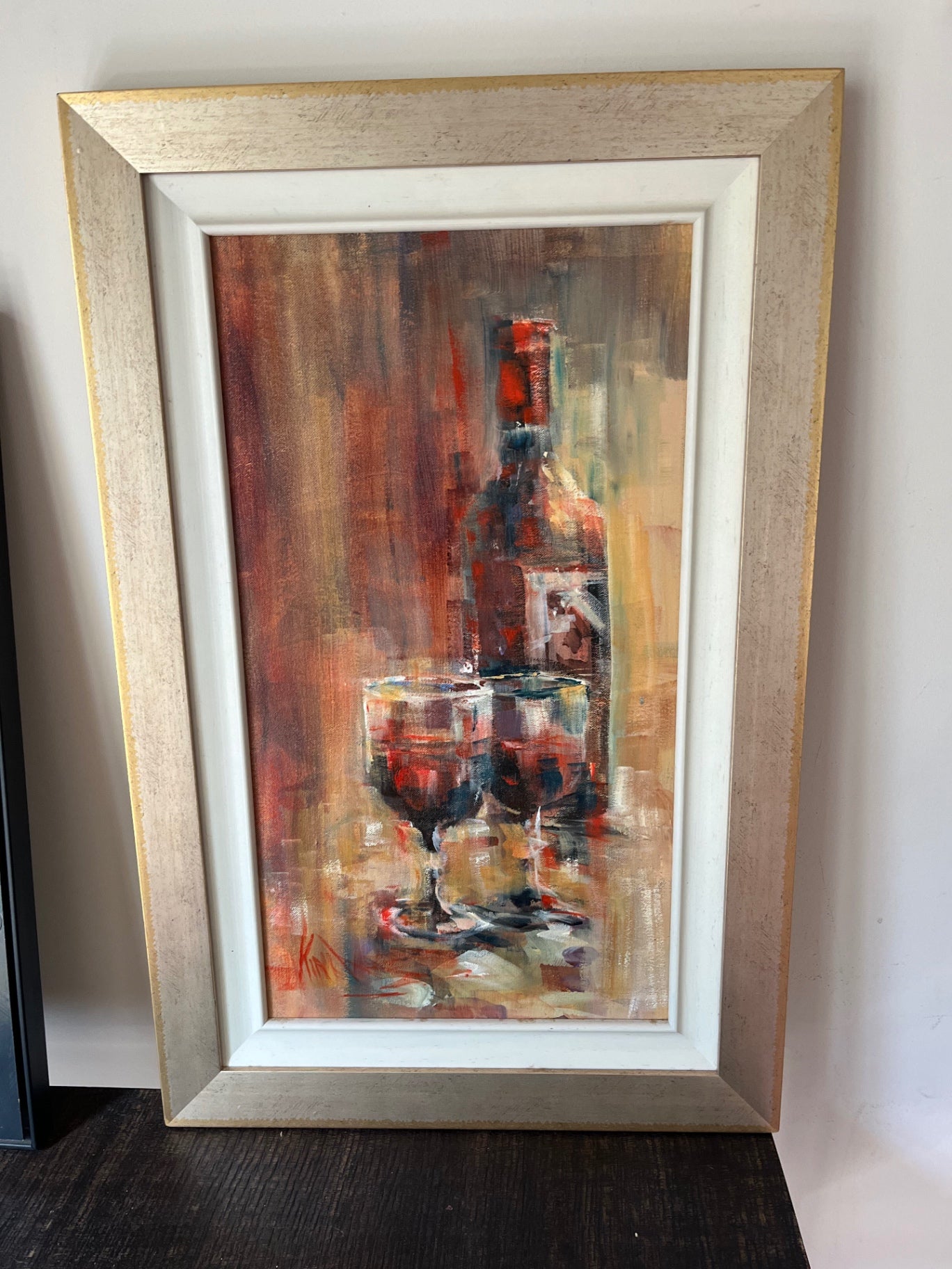 The wine bottle painting appears to be in good condition with no visible damage or flaws.
