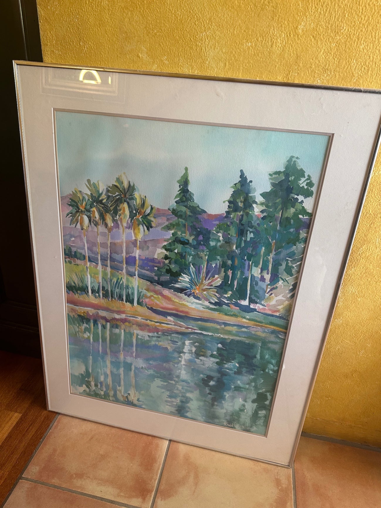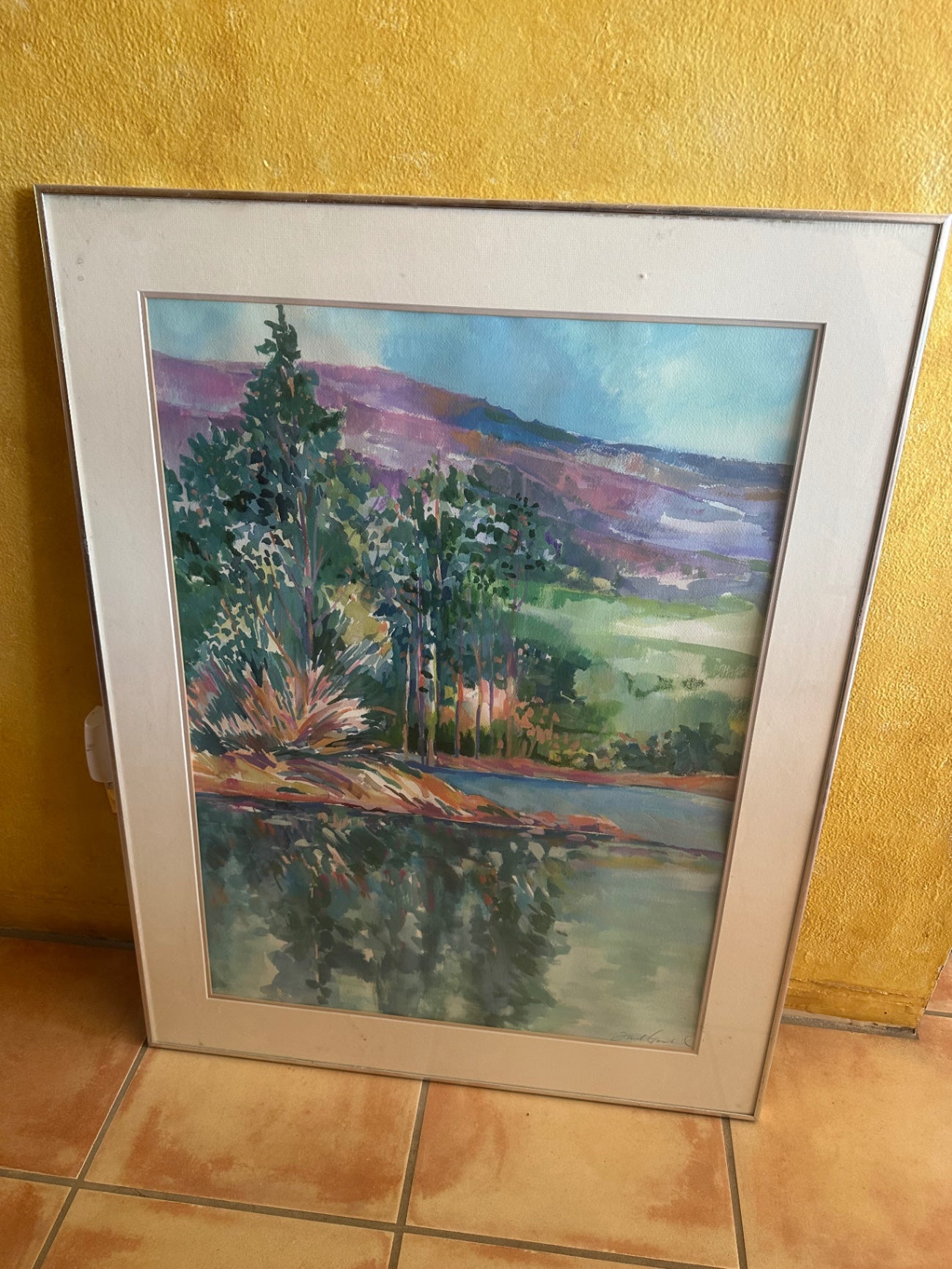 A framed watercolor painting depicting a landscape scene with trees, water, and rolling hills in the background. The painting features a mix of green, purple, blue, and pink hues and appears to be a landscape of nature with reflections on the water surface. The frame is a silver or metallic finish with an inner mat border that is white or off-white.