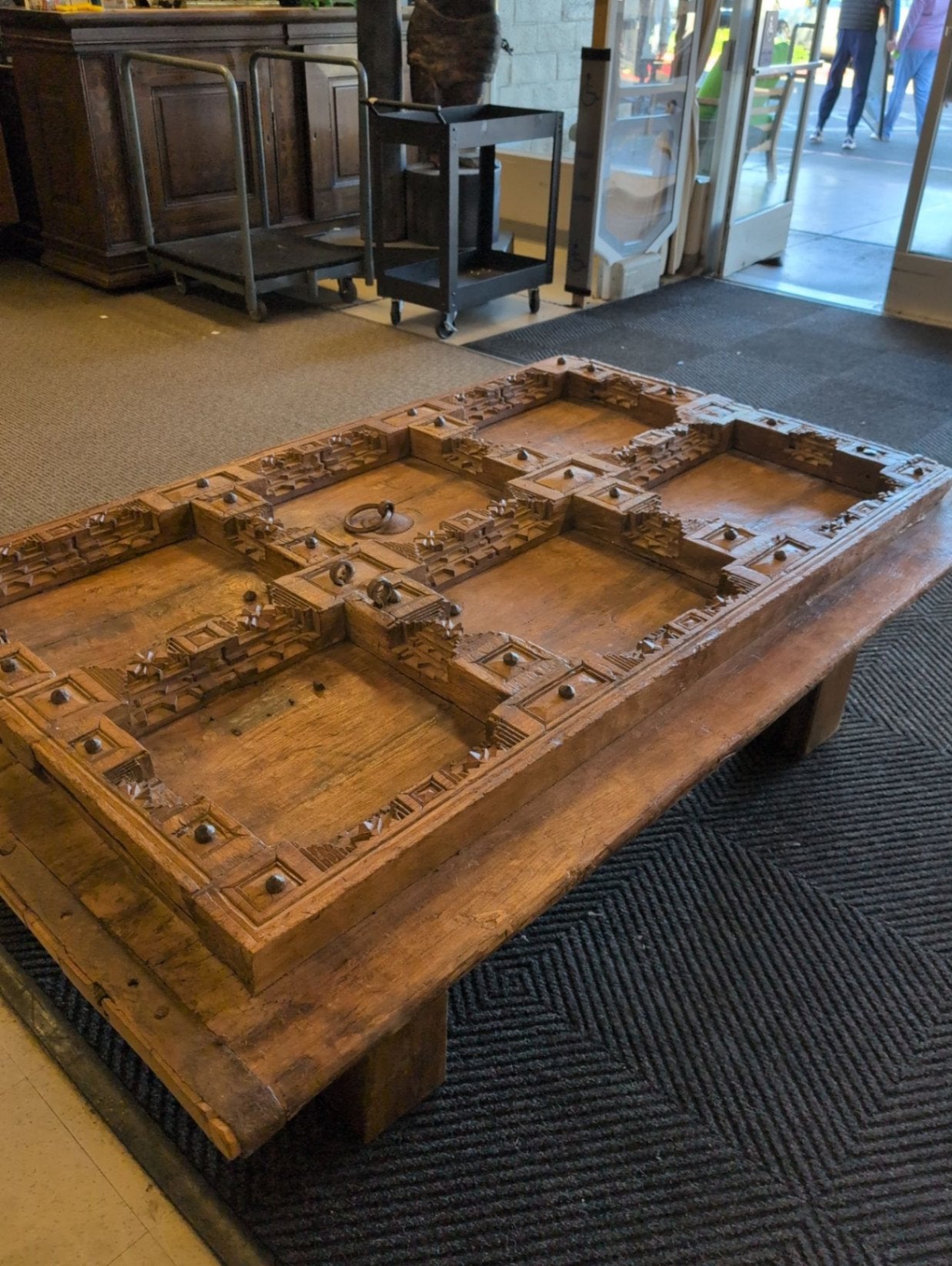 A handcrafted coffee table made from a carved door, showcasing intricate details and unique design. Constructed from solid wood with visible carving craftsmanship.