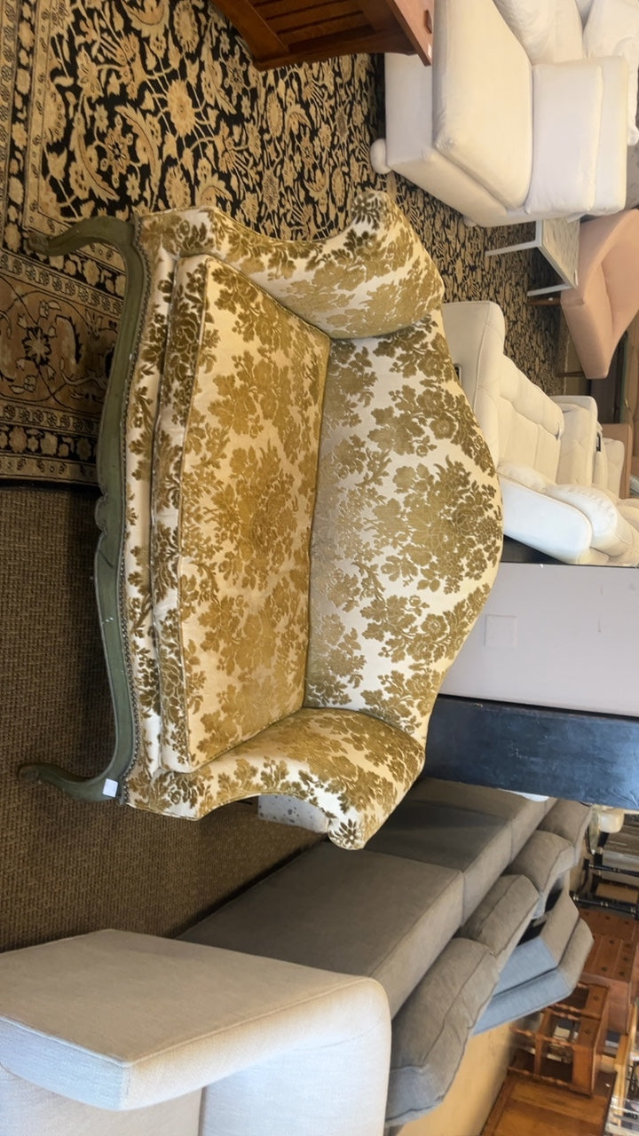A vintage-style loveseat with an ornate wooden frame painted in a muted green color. The upholstery features a gold damask pattern on a cream background, with curved arms and a tufted backrest. The piece has cabriole legs and detailed carvings along the frame edges, reflecting a classical design style. It is designed for seating in a lounge or sitting room and appears to be in good condition with no visible stains or tears in the fabric, though some signs of age may be present.
