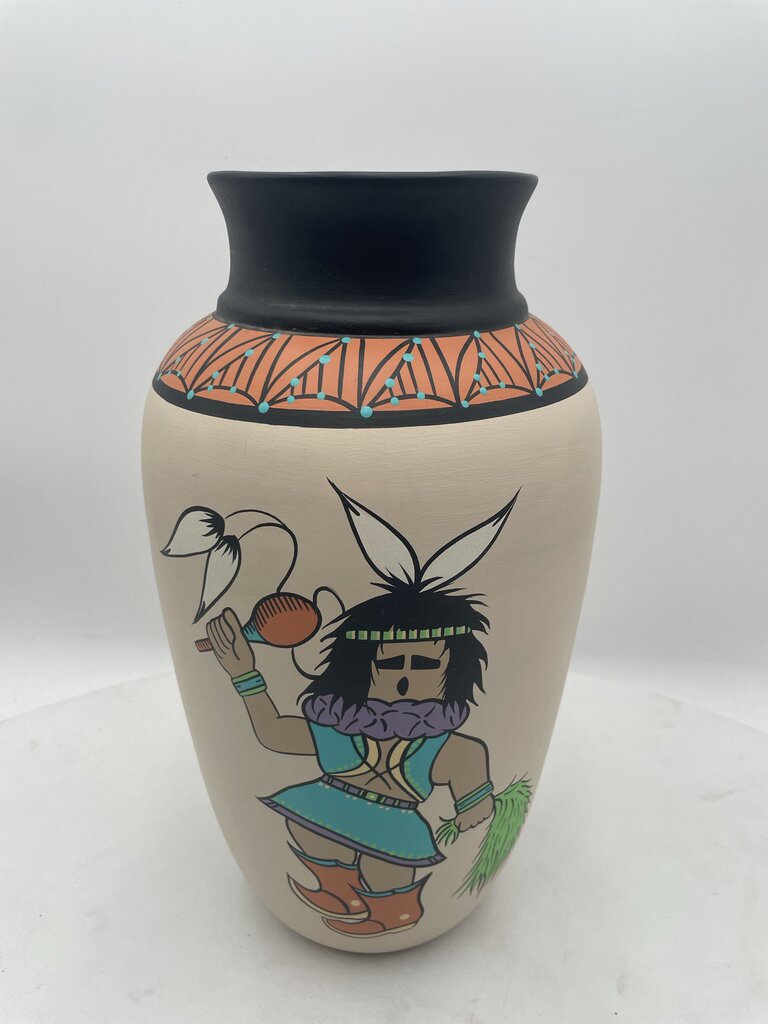 12.5"H x 7"Dia. Excellent Condition Signed Native American Navajo Mystique Maiden "Yei Bi Chi Dancer" Hand Painted White Vase by Dawn