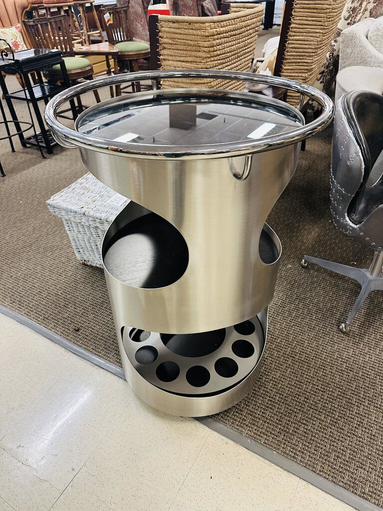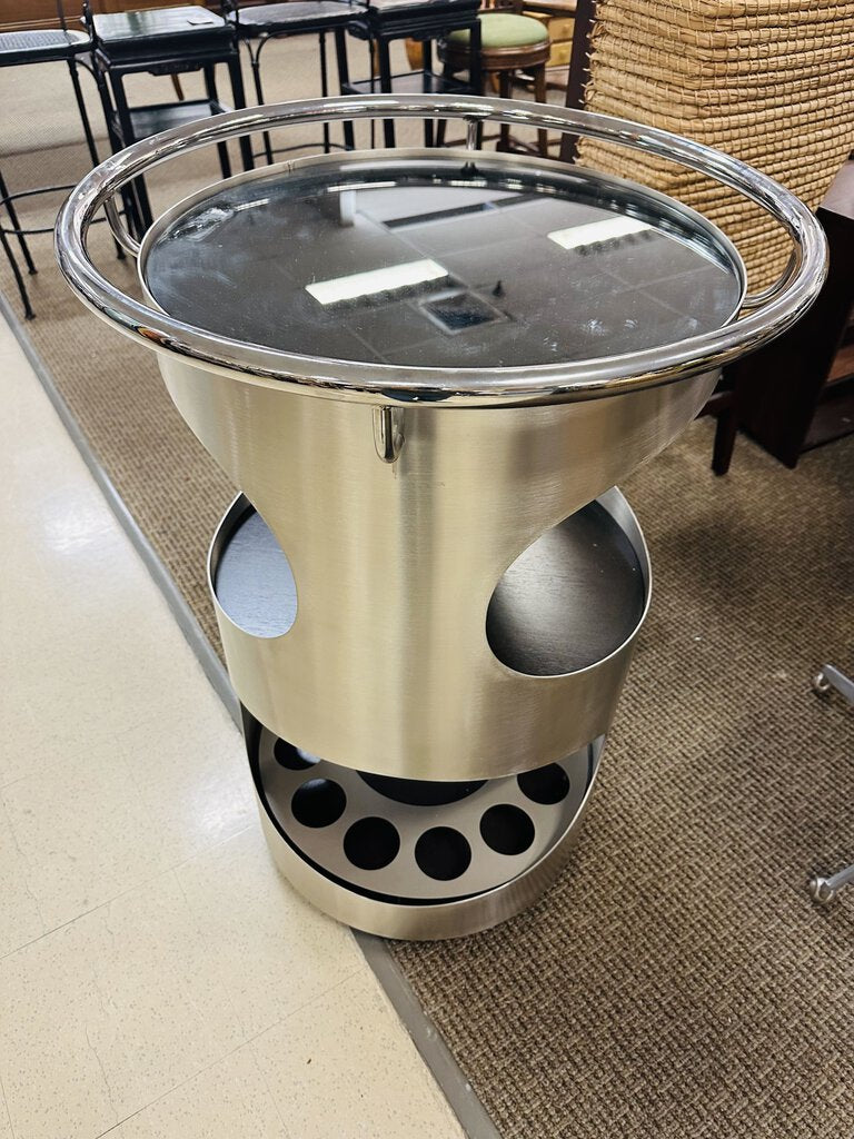 Round stainless steel design bar on casters, measuring 27 x 40, sourced from a consignment setting for flexible use in contemporary interiors or workshop environments. The piece is built from stainless steel to provide durability and ease of maintenance, with a clean, minimalist profile that suits modern or industrial design aesthetics. Mounted on a mobile base with casters, it supports quick repositioning to reconfigure workspaces, display areas, or service stations as needs change. Its compact footprint makes it a versatile surface for light prep, temporary setups, or portable demonstrations in kitchens, studios, galleries, or retail spaces.