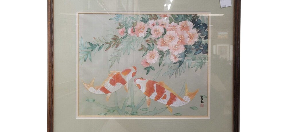 Framed Koi Fish Cherry Blossom Canvas is a wall art piece offered by Miss Daisy's Consignment & Auction House. The work features two koi fish, white with orange markings, swimming beneath a spray of cherry blossoms. It is a printed canvas mounted in a light green mat and encased in a dark brown wooden frame with a slim profile, with a small red signature mark in the lower-right corner.