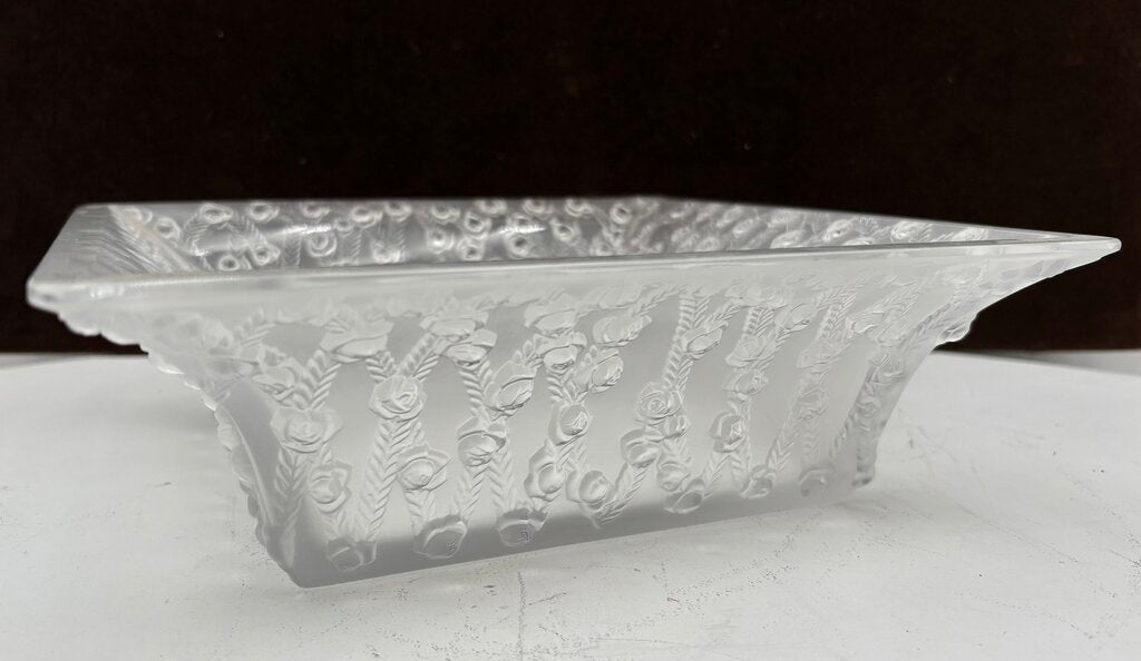 3"H x 9.6"Sqr. Very Good Condition Signed Bottom edge Rene Lalique Roses Square Crystal Bowl 9.6"