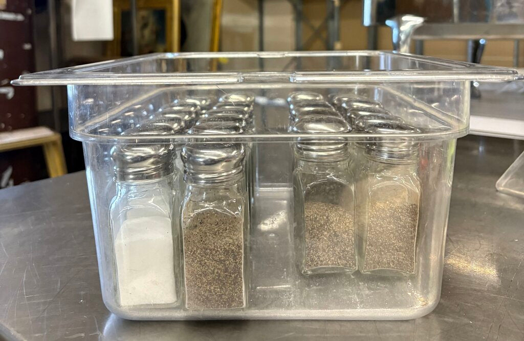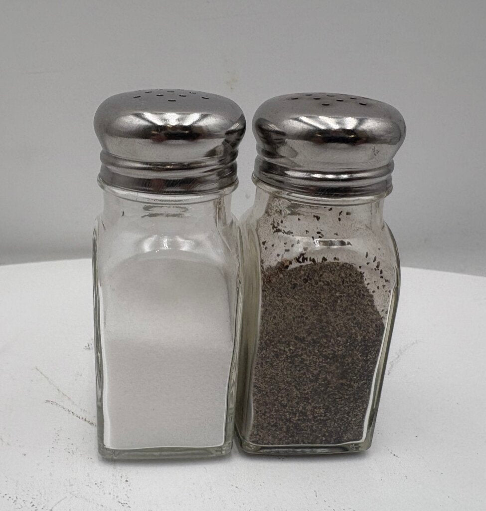 This stainless steel-lidded salt and pepper glass shaker set includes two identical vessels designed for tabletop use. Each shaker features a clear glass body with a stainless steel lid, standing about 4 inches tall and with a square footprint of 1.5 inches. The combination of transparent glass and metal caps yields a simple, timeless look that works well in everyday dining or more formal table settings. The visible contents through the glass and the compact, restrained form make this pair a practical, low-profile addition to any table or buffet setup.